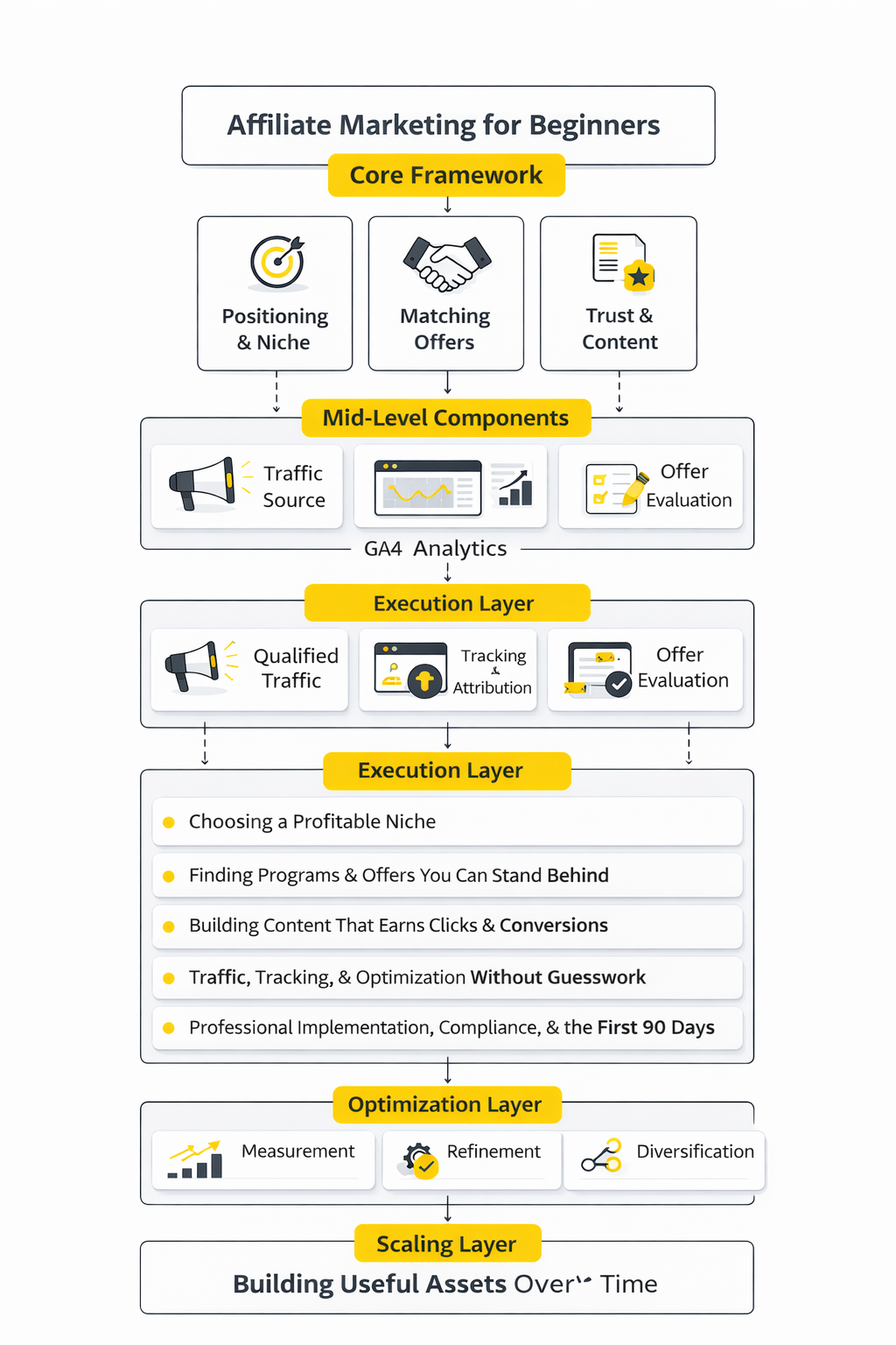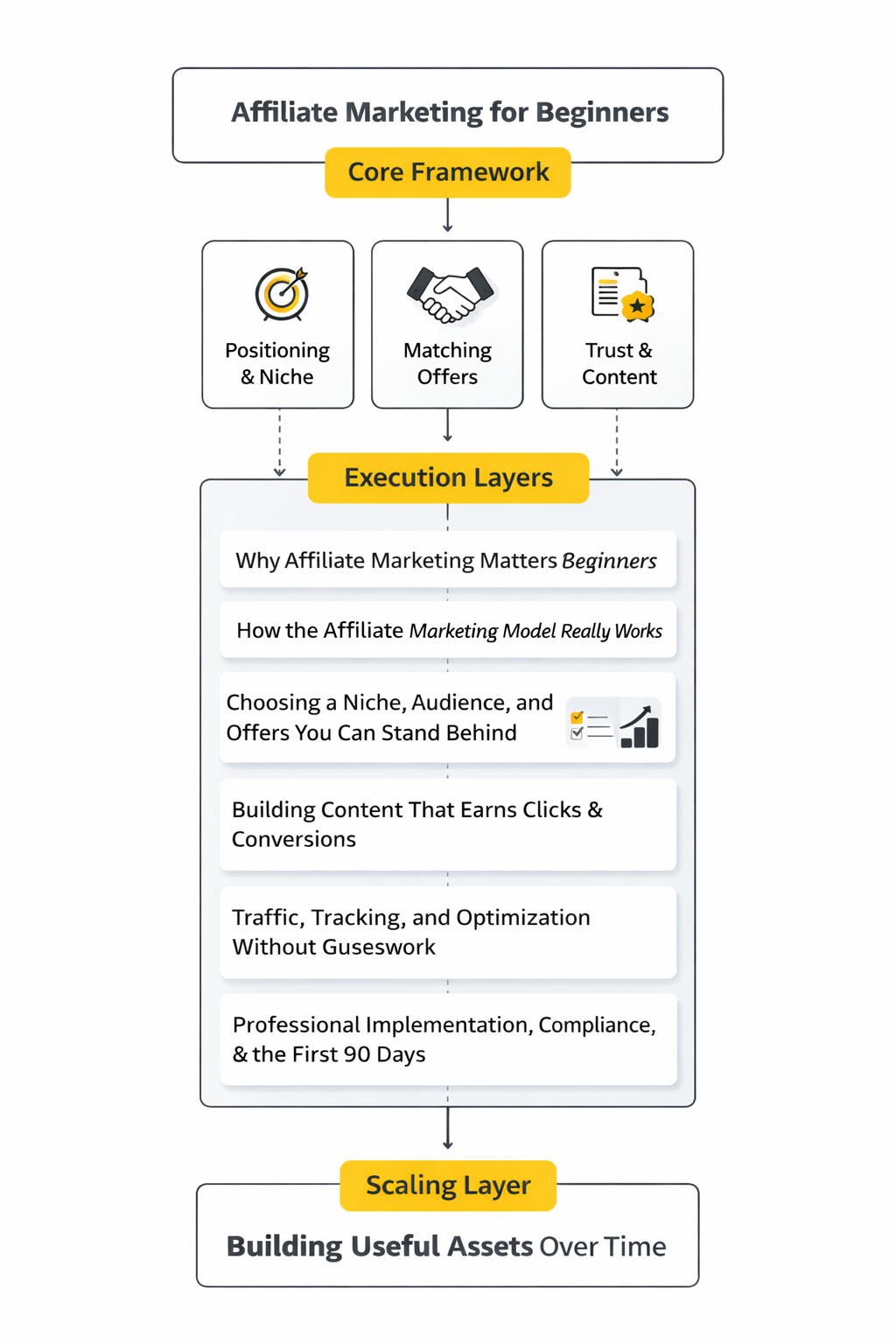 This guide is split into six parts so you can build the right foundation before getting into tactics. The order is deliberate. First you need the model, then the moving parts, then the execution layer, because beginners usually fail when they jump straight to tools and traffic before they understand buyer intent, content fit, and compliance.