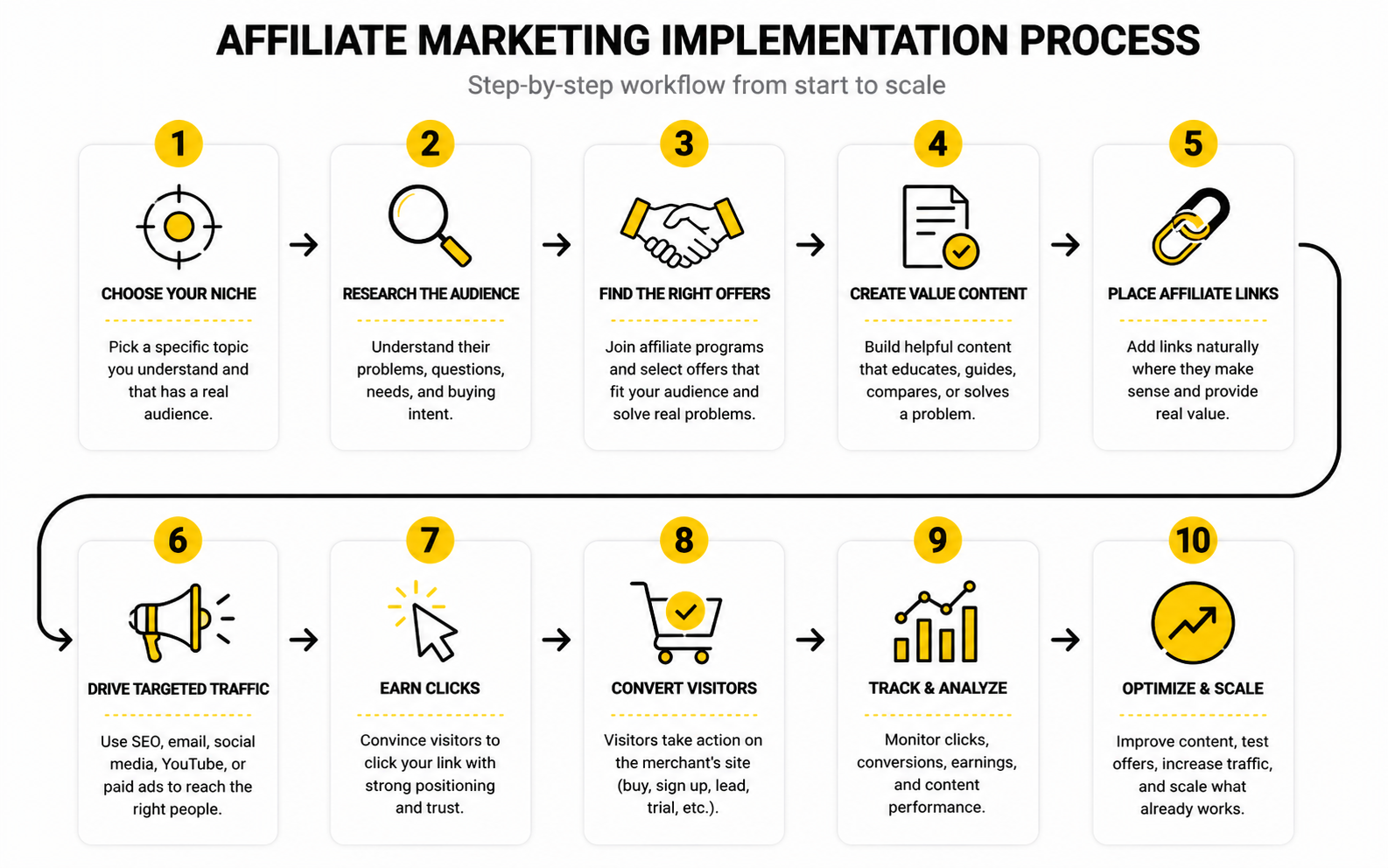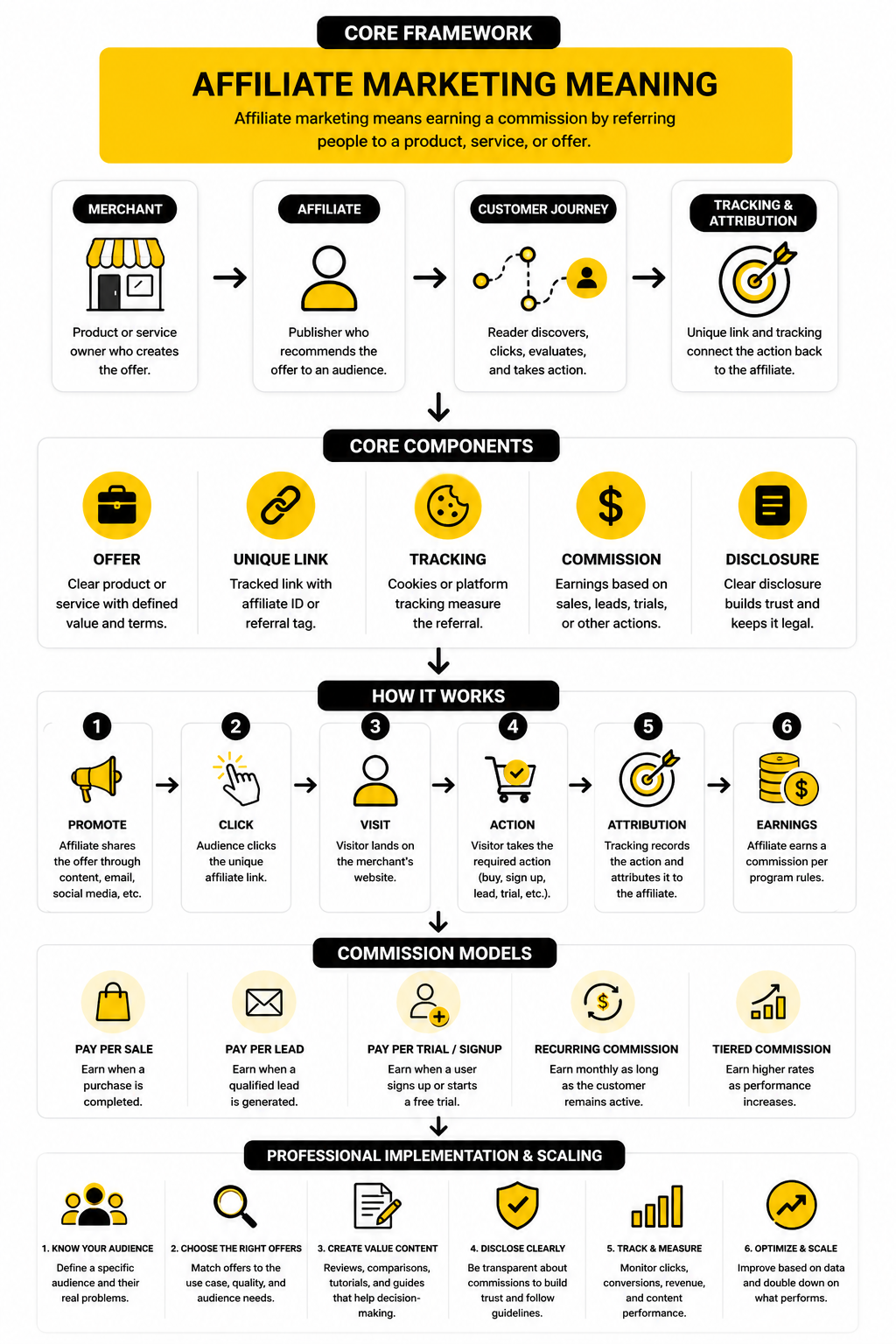 A strong implementation process turns affiliate marketing from random promotion into a repeatable system. You define the audience, choose offers that fit, create content around real decision points, disclose the relationship clearly, and track what happens after the click. That is the practical affiliate marketing meaning in a business context: a referral engine that can be measured, improved, and trusted.