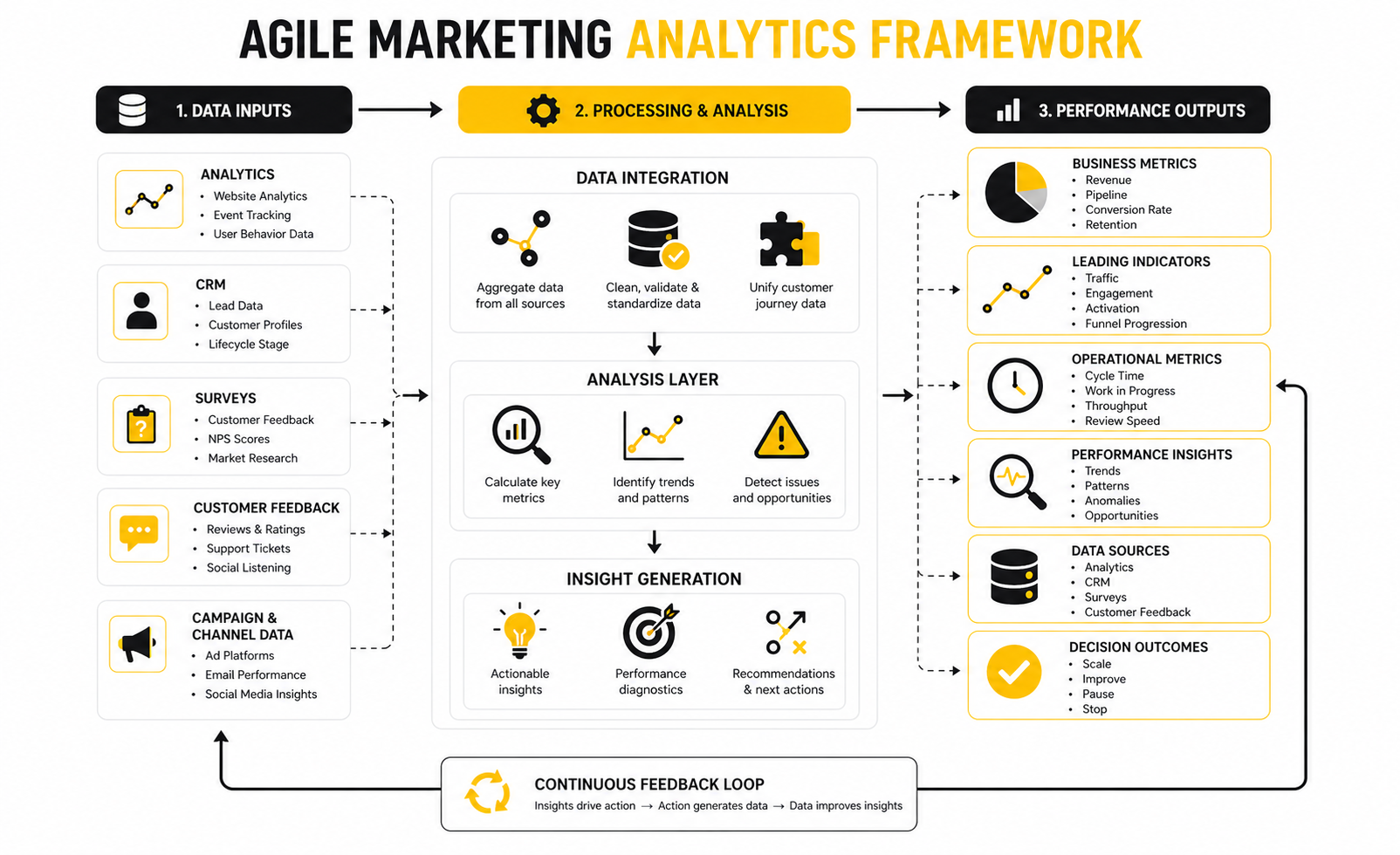 Agile marketing usually combines three practical layers: strategy, workflow, and learning. Strategy defines the outcome the team is trying to create. Workflow turns that outcome into visible, prioritized work. Learning closes the loop by using customer signals, campaign data, and team retrospectives to improve the next cycle.