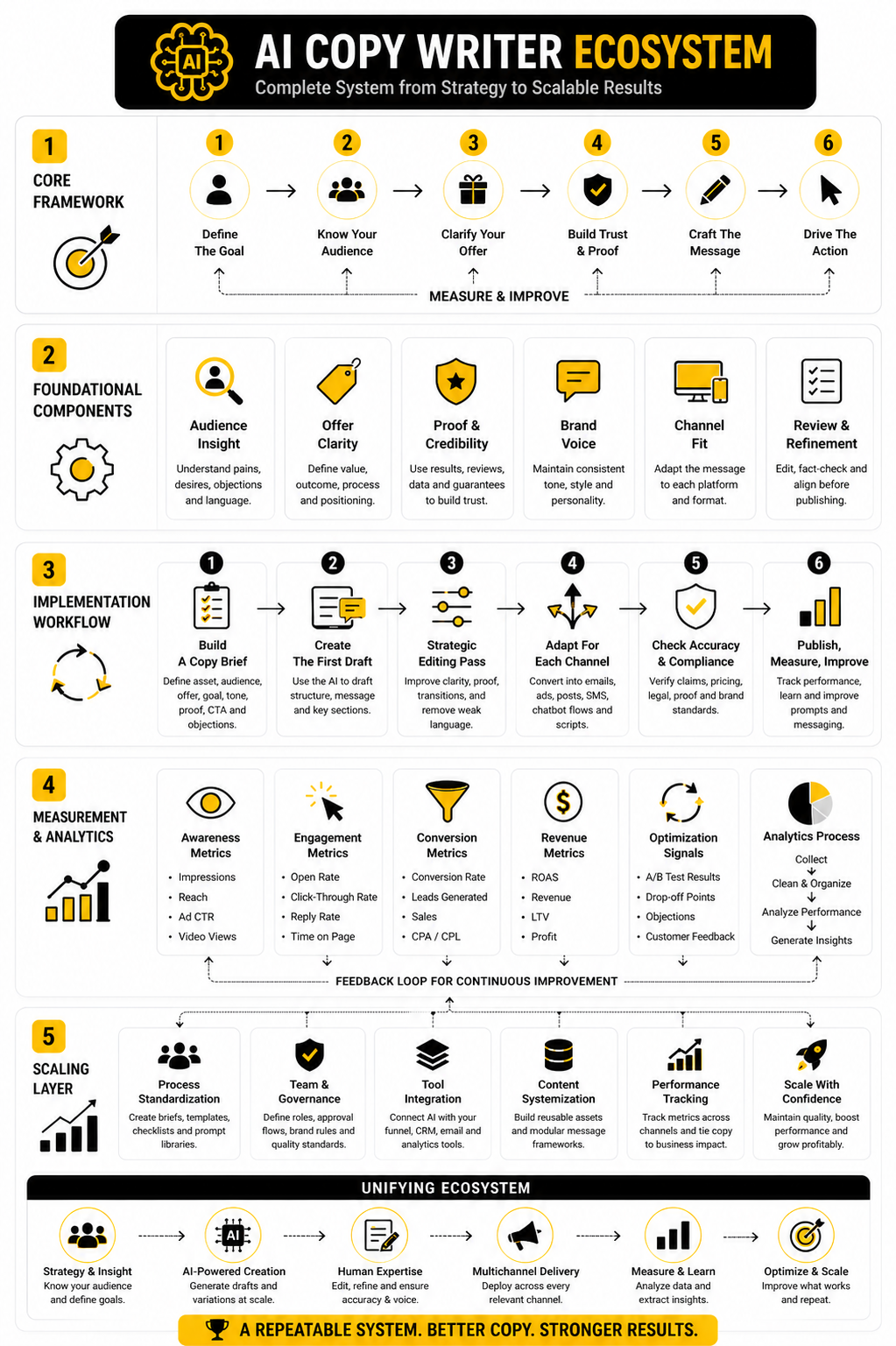 A strong AI copy system connects research, drafting, review, publishing, automation, and performance feedback. Each part should support the next one. Customer insights improve prompts, prompts improve drafts, drafts become campaigns, campaigns produce data, and data improves the next brief.