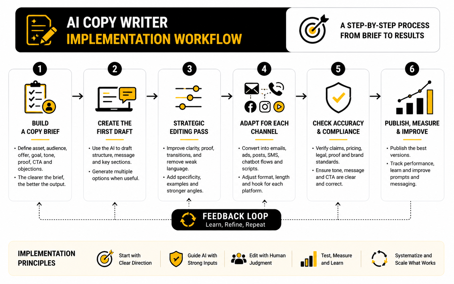 The best implementation process starts before the draft and continues after publishing. That matters because copy is not finished when it sounds good. It is finished when it is accurate, aligned with the campaign goal, approved, published, and measured.
