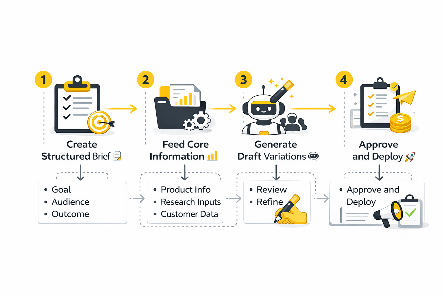 The cleanest implementation process is to move through the same sequence every time. First gather the source material. Then define the copy brief. Then generate multiple structured drafts. Then review, trim, fact-check, and adapt the winner to the final channel.