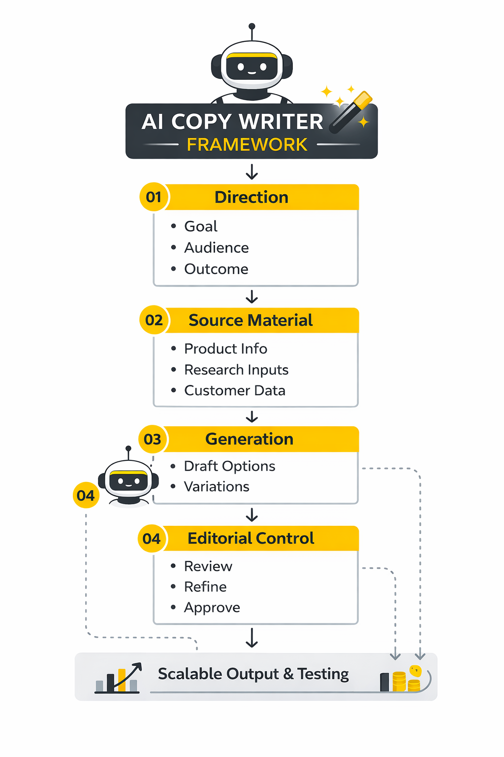 The cleanest way to think about an ai copy writer is as a four-layer system. First comes direction, because the model needs a goal, audience, and outcome. Then comes source material, because the model needs something real to work from. Then comes generation, where drafts and variations are produced. Finally comes editorial control, where human judgment turns plausible copy into publishable copy.
