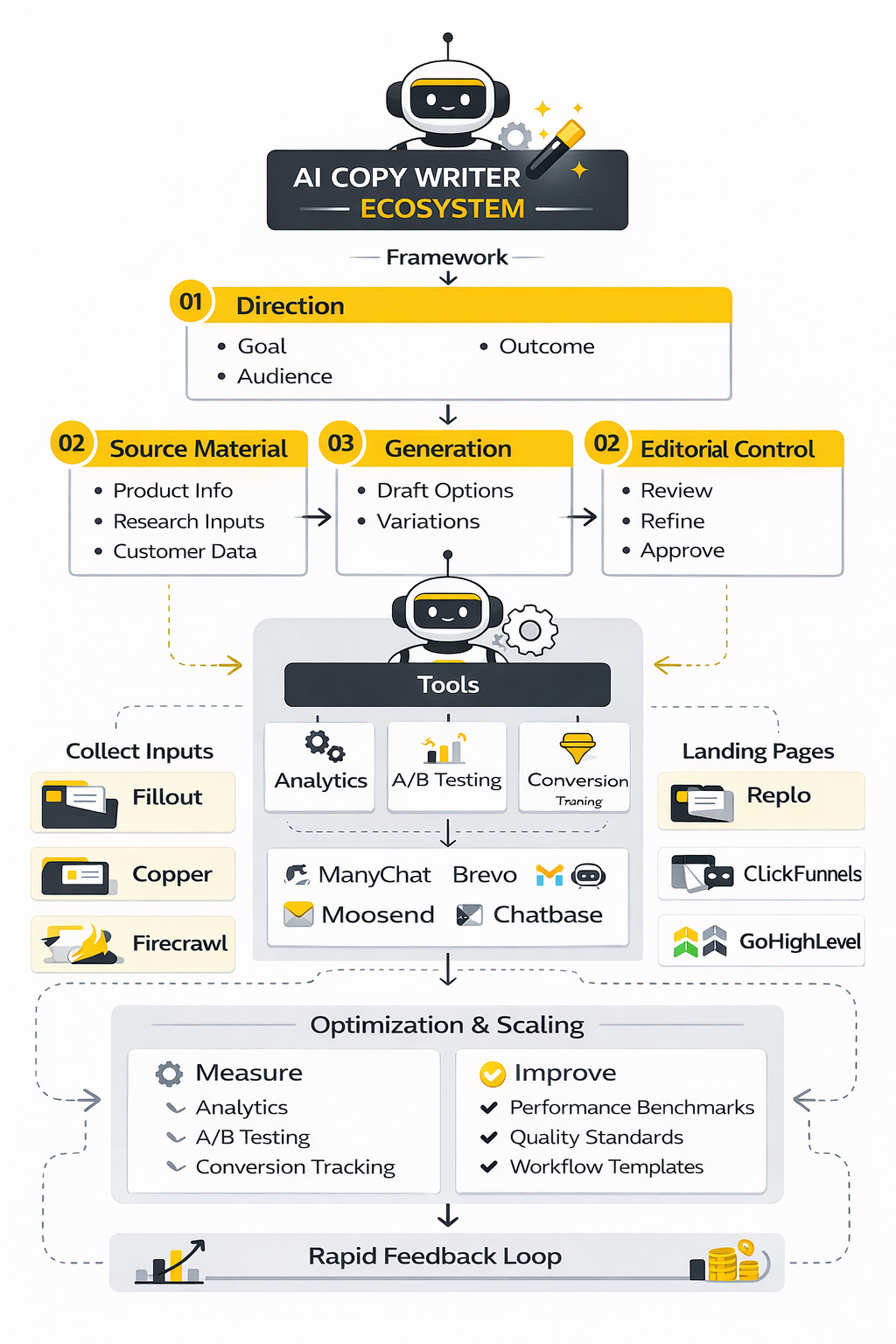 That depends on what you are building, but the pattern is consistent. You need a place to collect input, a place to generate and refine copy, and a place to deploy and measure it. In live workflows, that often means combining messaging and automation tools like ManyChat, Brevo, and GoHighLevel with page and funnel systems like Replo, ClickFunnels, or Systeme.io.