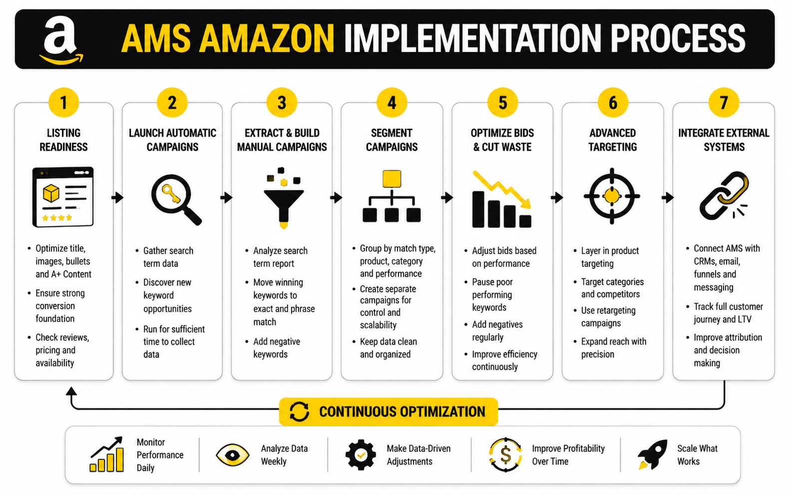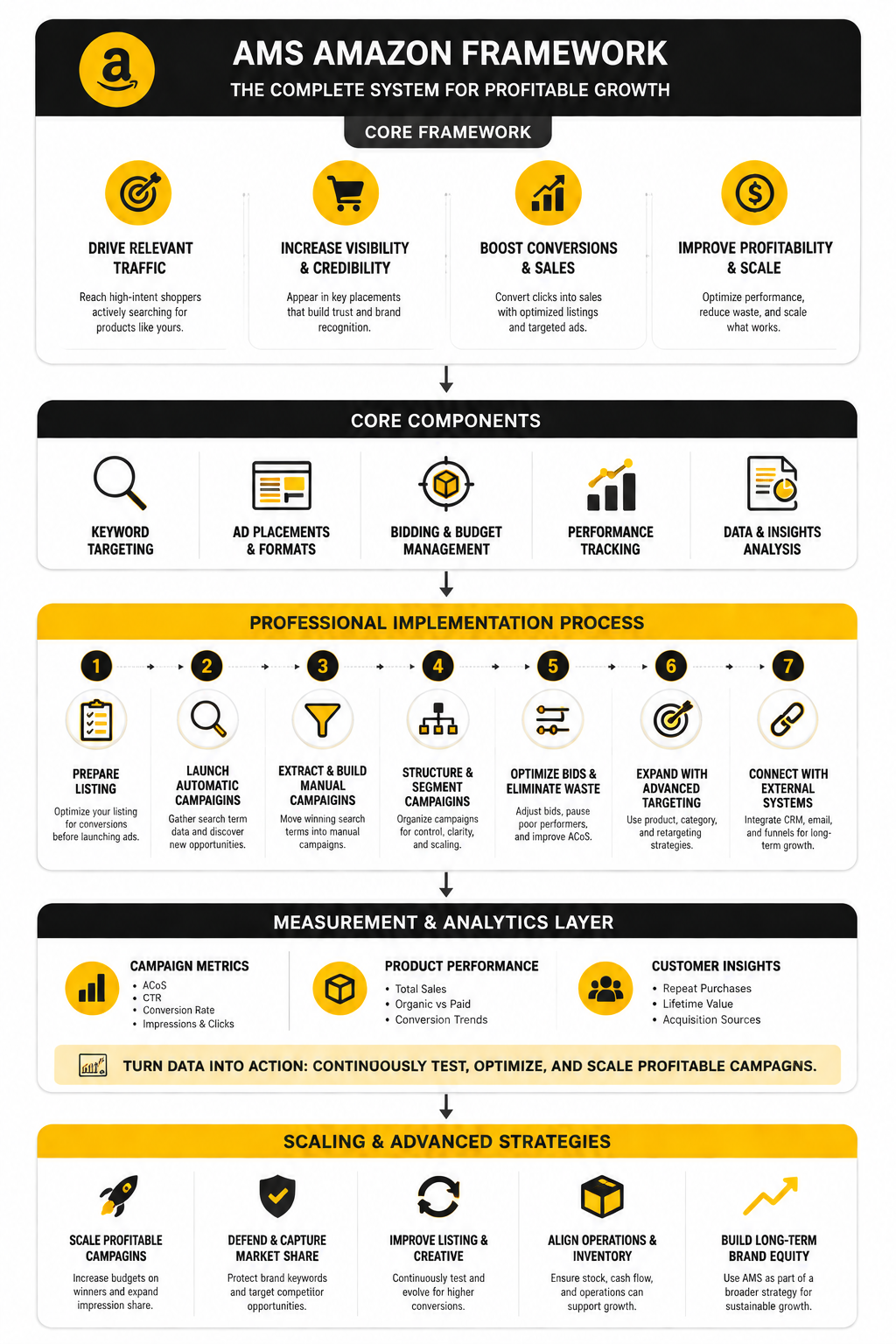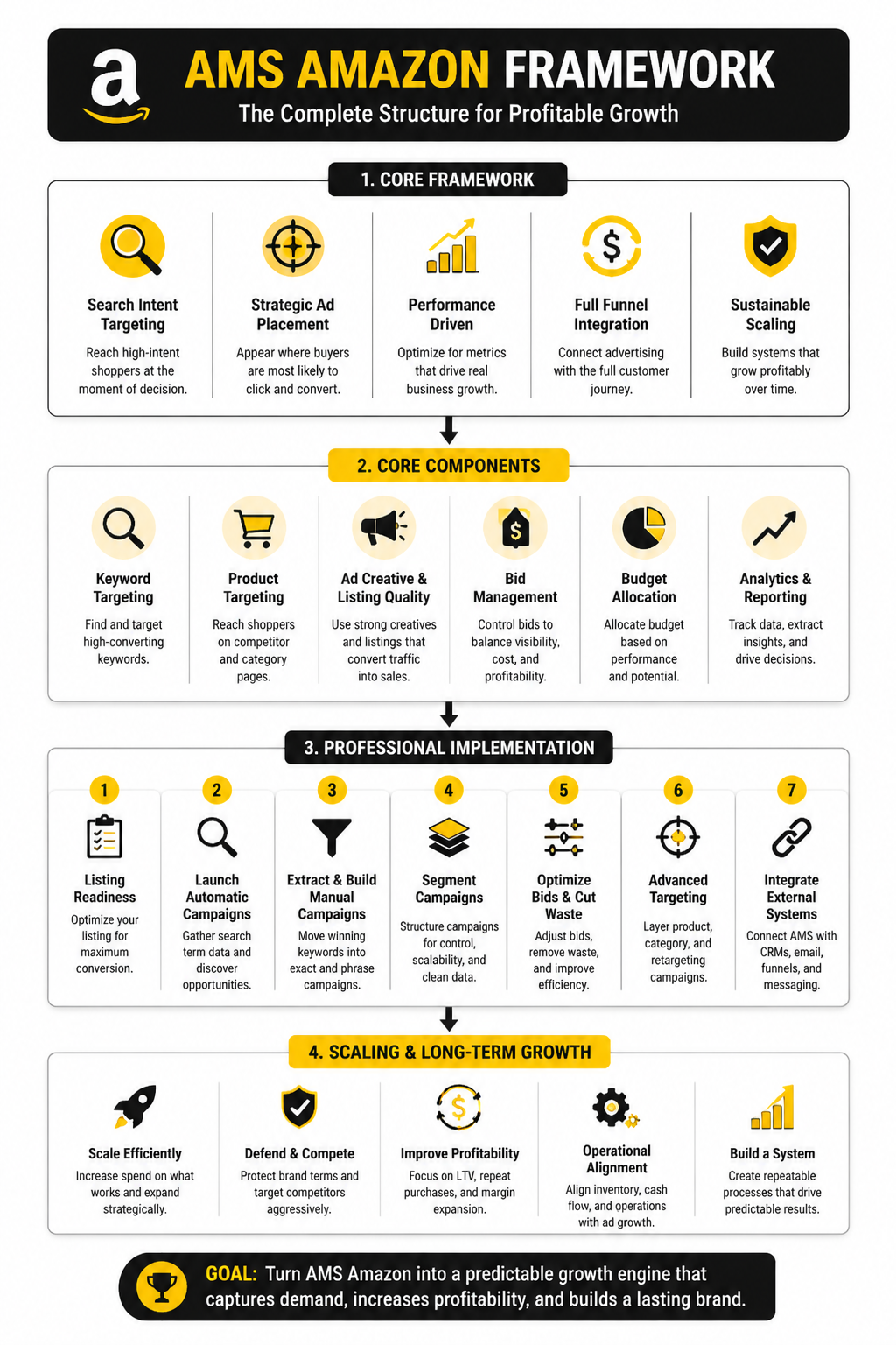 AMS Amazon is not a magic button. It is a growth system that only works when the product, listing, campaign structure, analytics, inventory, and customer journey all support each other.