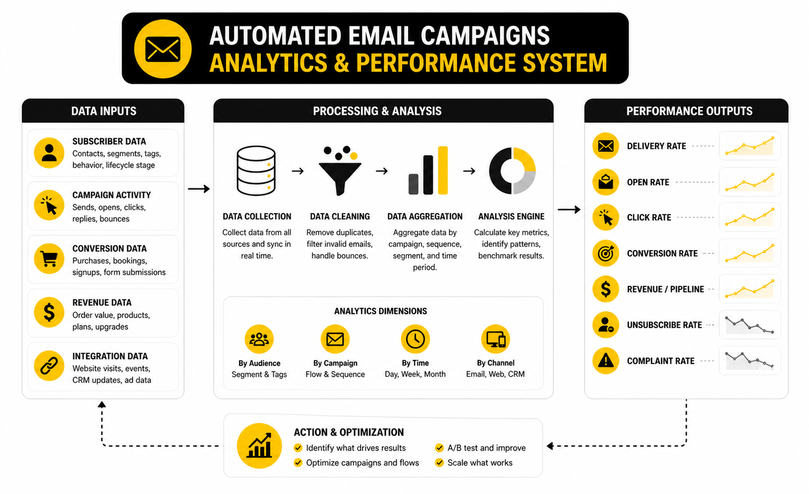 A practical analytics system should connect each campaign to one primary business outcome. You do not need twenty metrics for every workflow. You need the few numbers that explain whether the campaign is moving people forward or leaking attention.