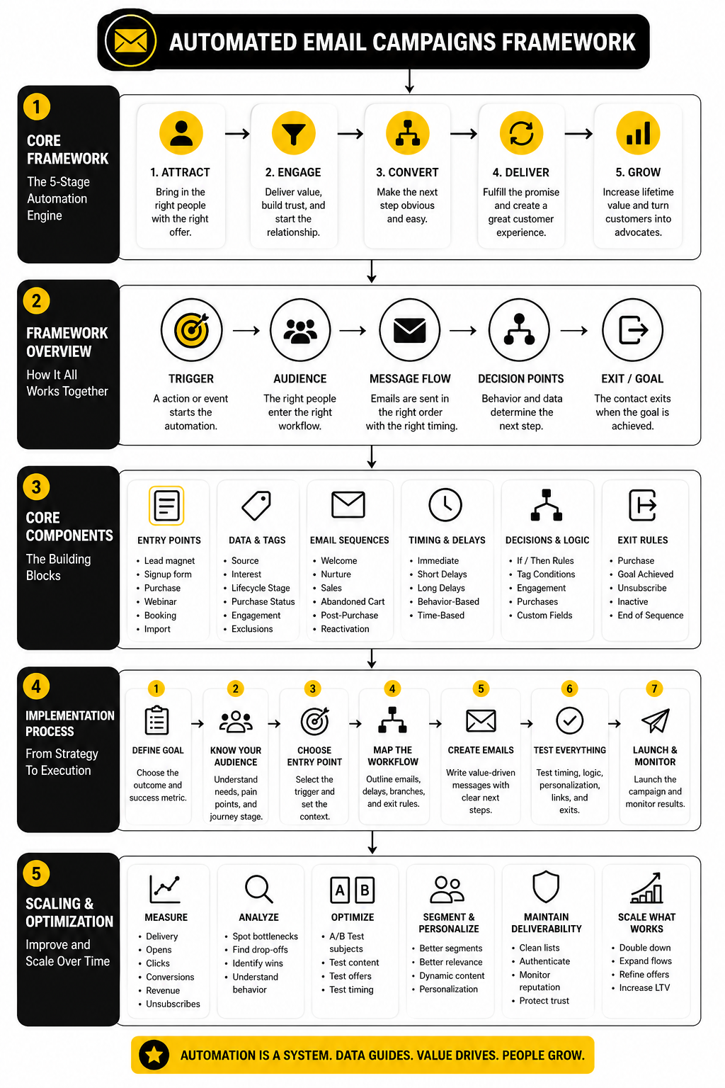 A practical framework keeps the system focused. It gives every campaign a clear role, every trigger a reason to exist, and every email a job that supports the customer journey.