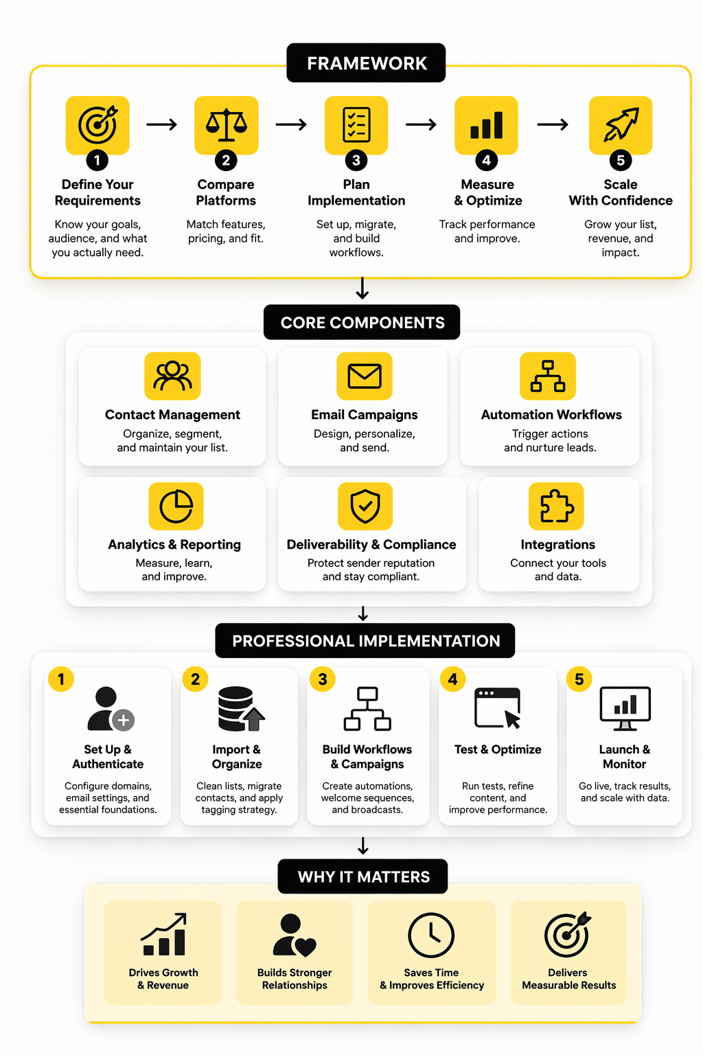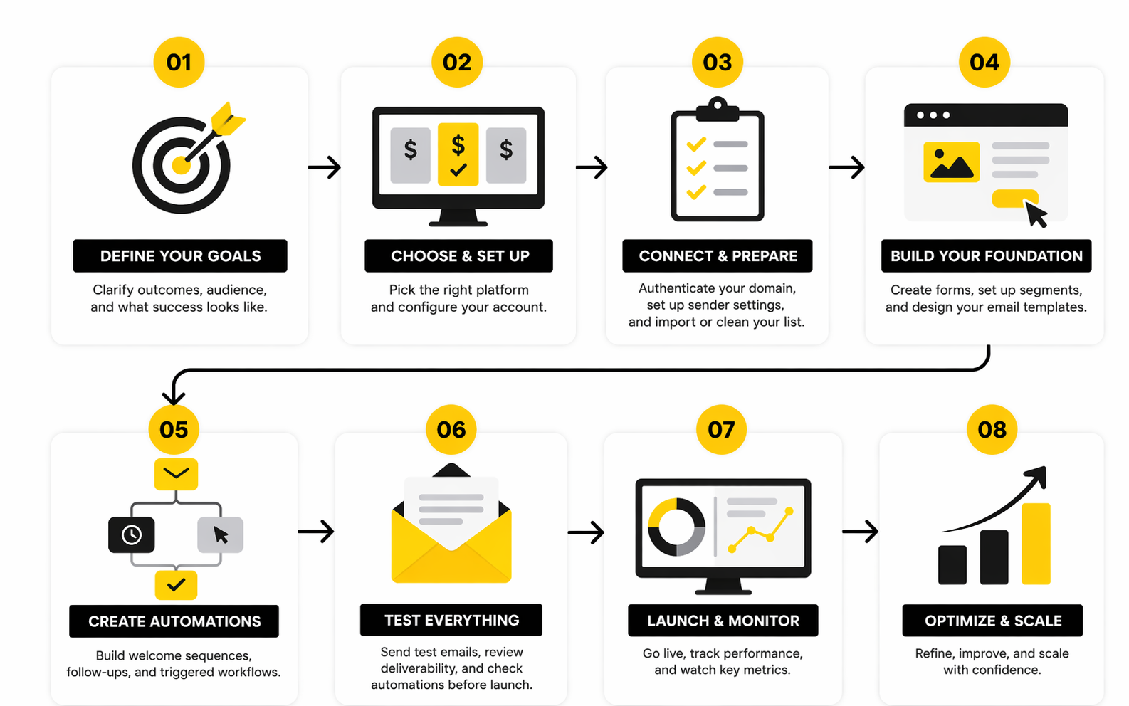 Choosing the platform is only half the job. The businesses that actually get results are the ones that implement with discipline instead of importing a list, sending one campaign, and declaring the software a success or failure. Good implementation is boring in the best possible way. It is structured, deliberate, and tied to real business outcomes.