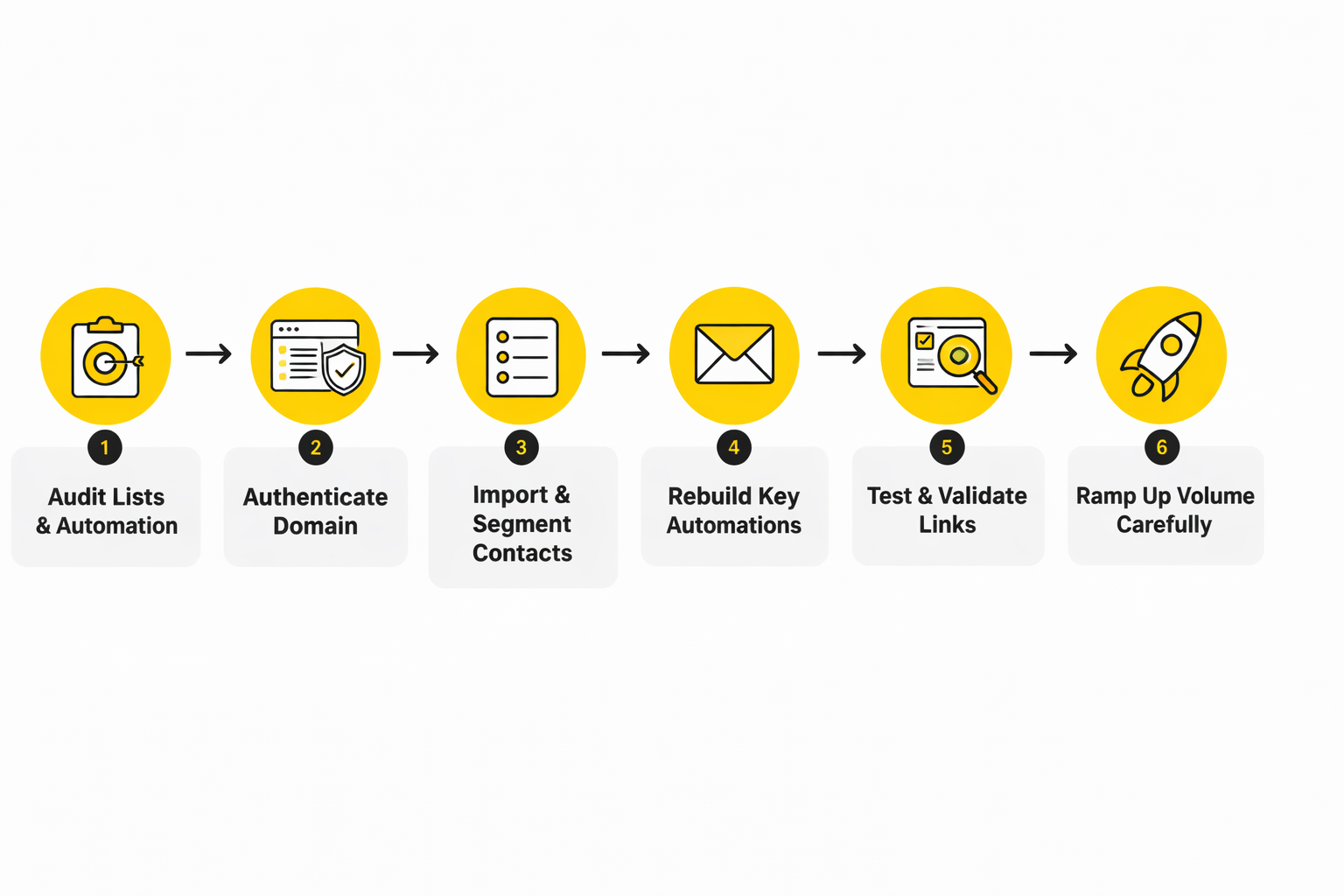 The cleanest rollout usually follows a predictable order. First, define the business goal for the platform so you know whether success means more sales, better follow-up speed, stronger retention, or lower software sprawl. Second, configure authentication and sender infrastructure. Third, import contacts in a structured way with tags, custom fields, and suppression logic intact. Fourth, rebuild the essential automations. Fifth, test before you scale volume.