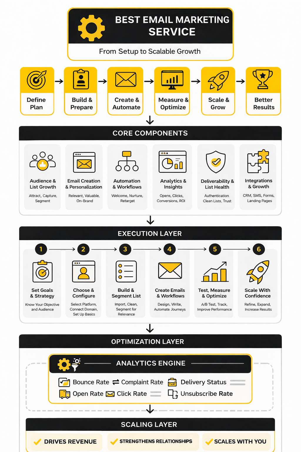 A practical analytics system is simpler than most dashboards make it look. You track delivery metrics first, engagement metrics second, and business metrics third. Delivery tells you whether messages are reaching inboxes. Engagement tells you whether the message resonates. Business metrics tell you whether the email program is creating outcomes that matter. (Google sender guidelines) (Yahoo sender best practices)