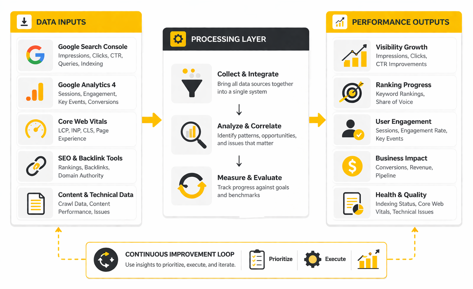 A serious measurement model should answer five questions clearly. Are more of the right pages getting seen? Are more of the right searches generating clicks? Are those visitors doing something valuable on the site? Are there experience or indexing problems limiting progress? And are changes in performance tied to shipped work rather than random weekly noise? If an agency cannot answer those questions cleanly, its reporting may be active, but it is not useful.