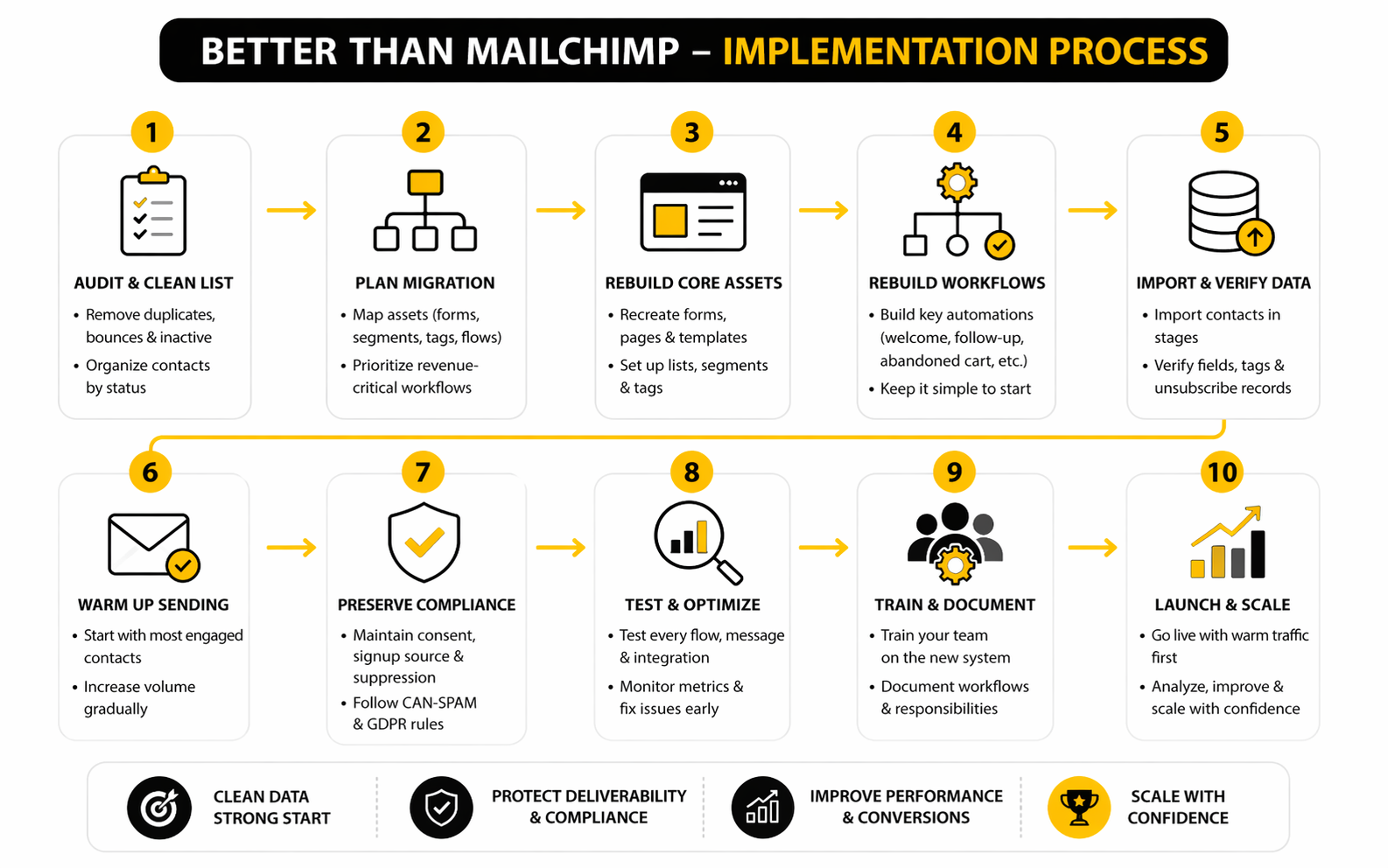 The goal is not to move everything at once. The goal is to move the right assets in the right order, protect deliverability, and avoid interrupting revenue-producing campaigns. Treat migration like a controlled rollout, not a weekend copy-paste job.