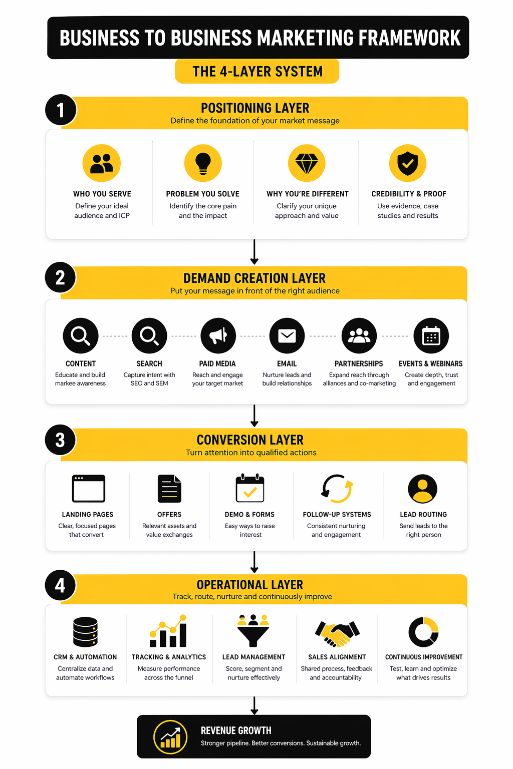 That is why the strongest framework is built in layers, not random tactics. The first layer is positioning, which defines who you serve, what problem you solve, and why your approach is different. The second layer is demand creation, which puts that message in front of the right audience through content, search, paid media, email, partnerships, and direct distribution. The third layer is conversion, where landing pages, offers, demos, forms, and follow-up systems turn attention into action.