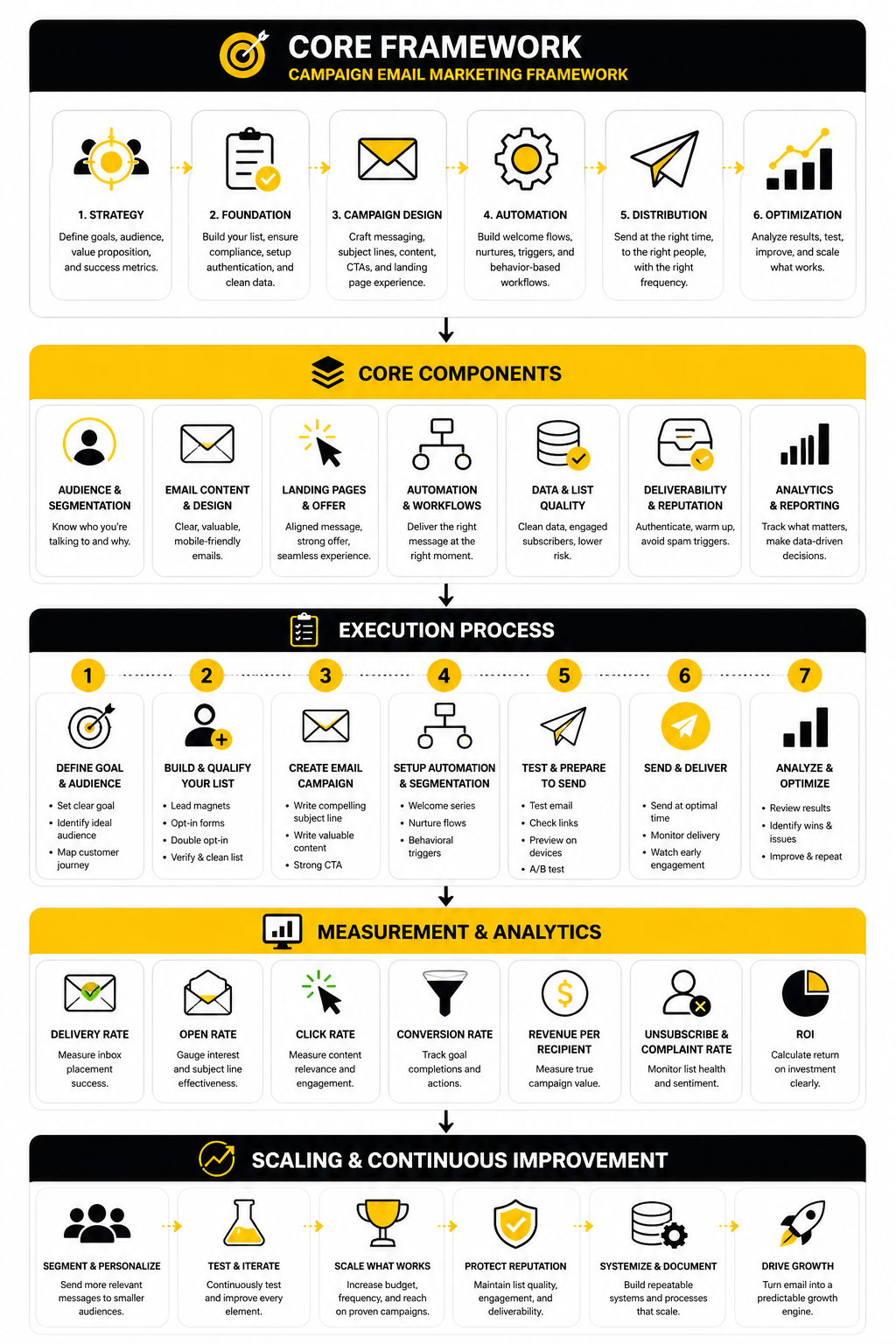 A practical email framework has four layers: audience, message, automation, and measurement. Audience decides who should receive the email. Message decides why they should care, automation decides when they receive it, and measurement decides what improves next.