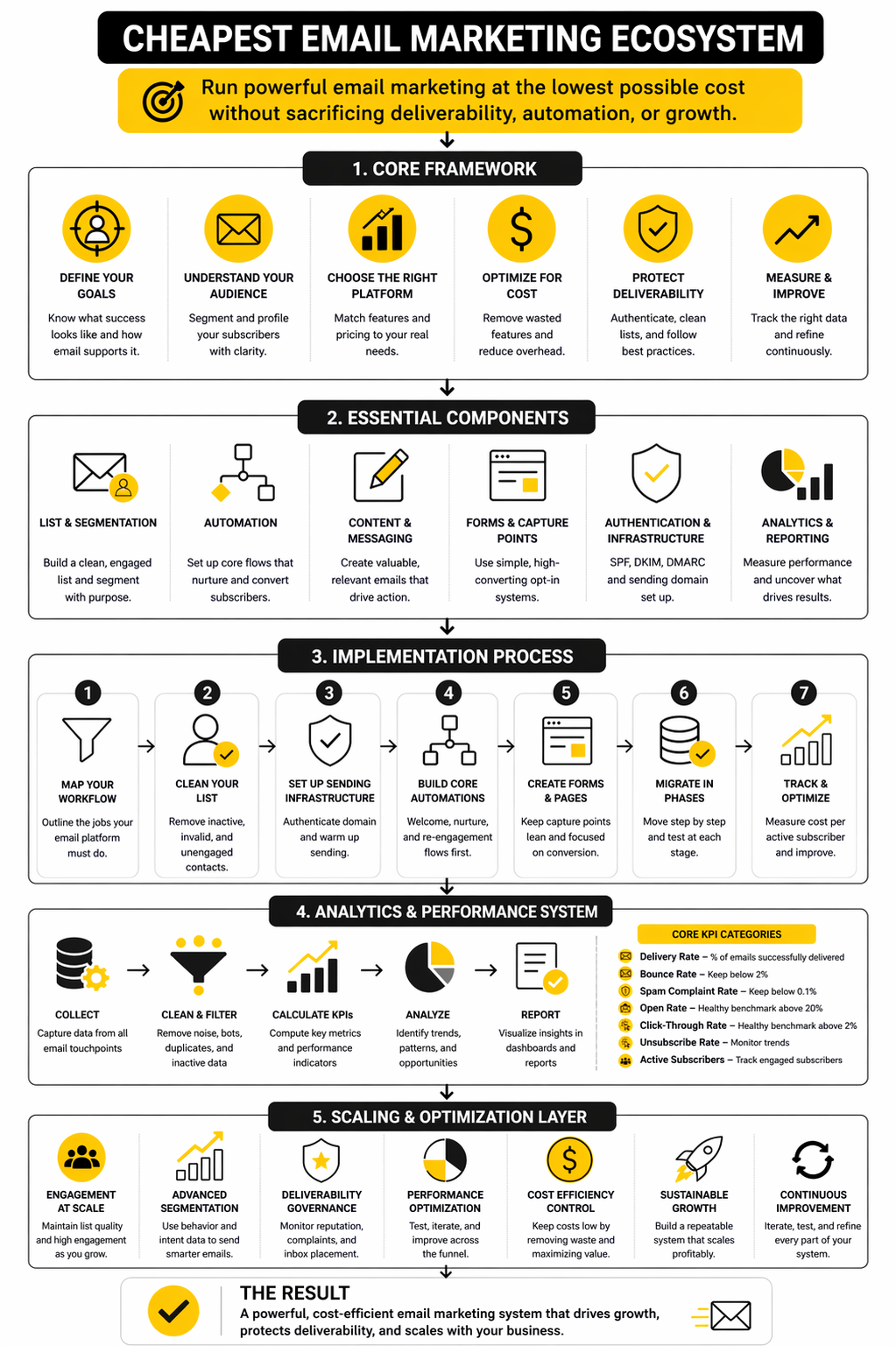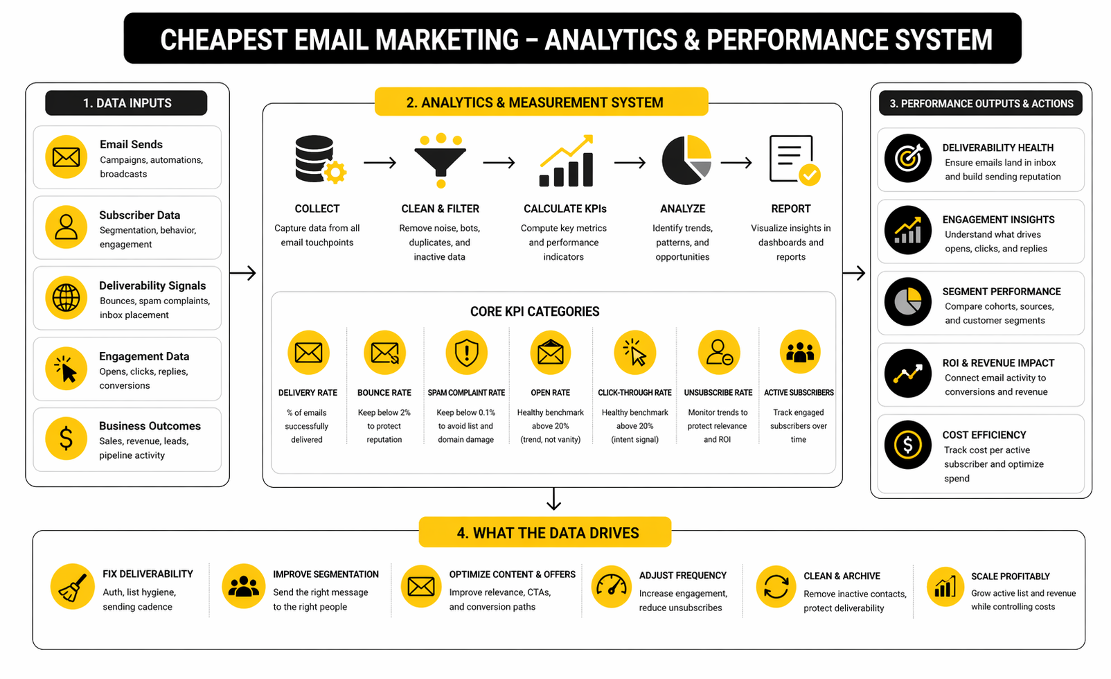 The point of analytics is not to collect dashboards. It is to decide what to fix next. A good measurement system tells you whether your cheapest email marketing setup is improving efficiency, protecting deliverability, and producing real commercial value instead of just reducing software spend.