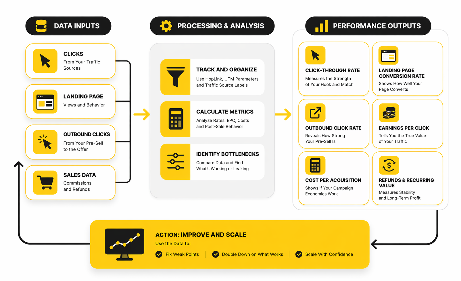 Data is useful only when it triggers action. If CTR is weak, fix the angle or audience match. If landing-page conversion is weak, tighten message clarity and reduce friction. If outbound clicks are weak, rebuild the bridge page so it actually earns the transition. If sales are weak after a strong handoff, revisit offer fit and sales-page alignment.