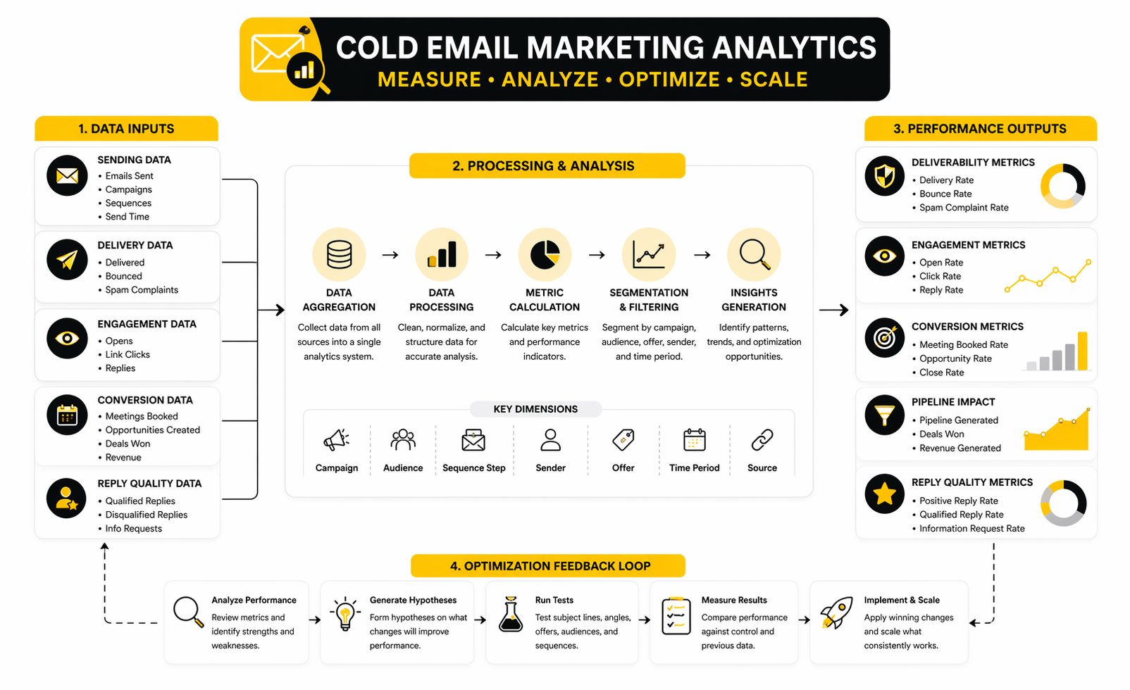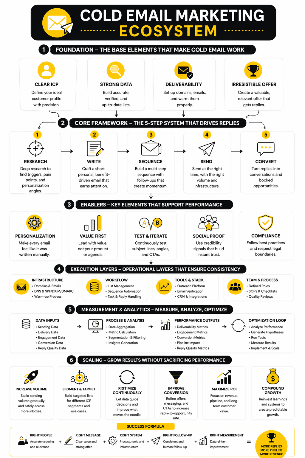 A complete cold email system connects strategy, execution, measurement, and optimization. The strategy defines who you contact and why. The execution layer turns that strategy into lists, sequences, deliverability controls, and follow-up workflows.