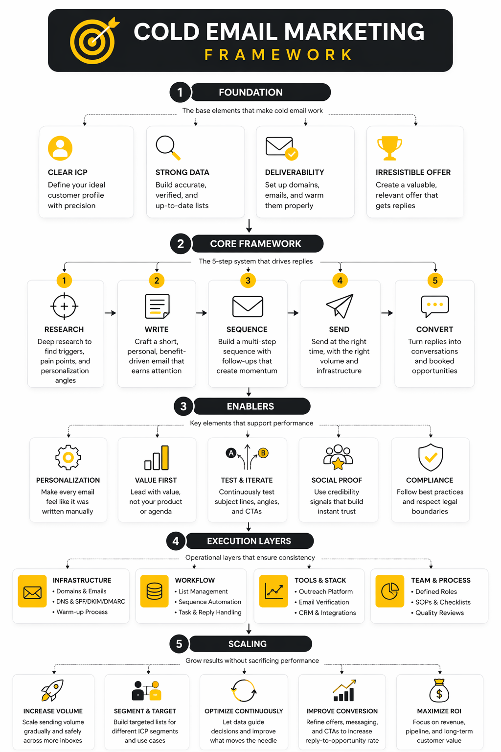 A strong cold email marketing system has four layers: audience, message, infrastructure, and follow-up. Each layer supports the next one. If one breaks, the campaign suffers even if everything else looks polished.
