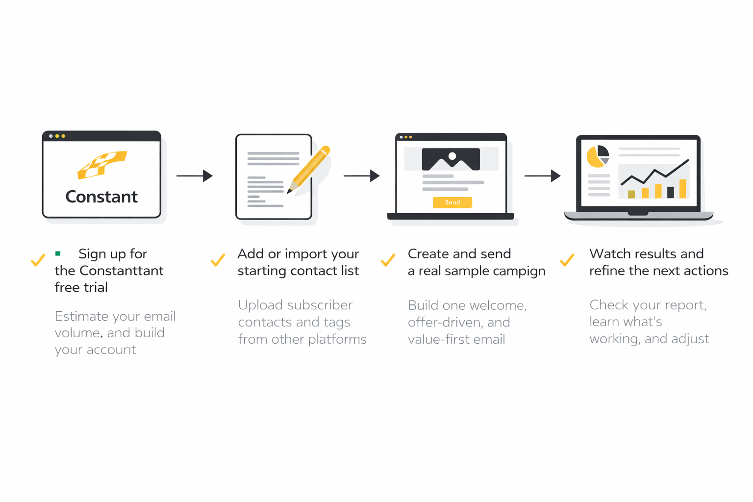 Week two should be about list growth and entry points. Create a sign-up landing page, review the default welcome automation that new accounts receive, and test the path from form submission to follow-up message. This is where the trial becomes useful because Constant Contact says new accounts are created with a sign-up landing page and welcome automation ready to customize, which gives you a practical starting point instead of a blank canvas.