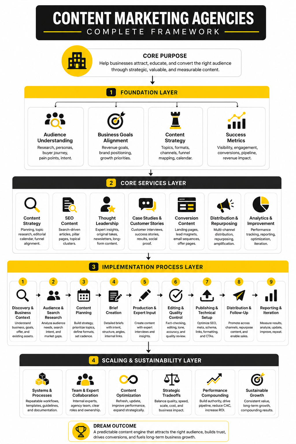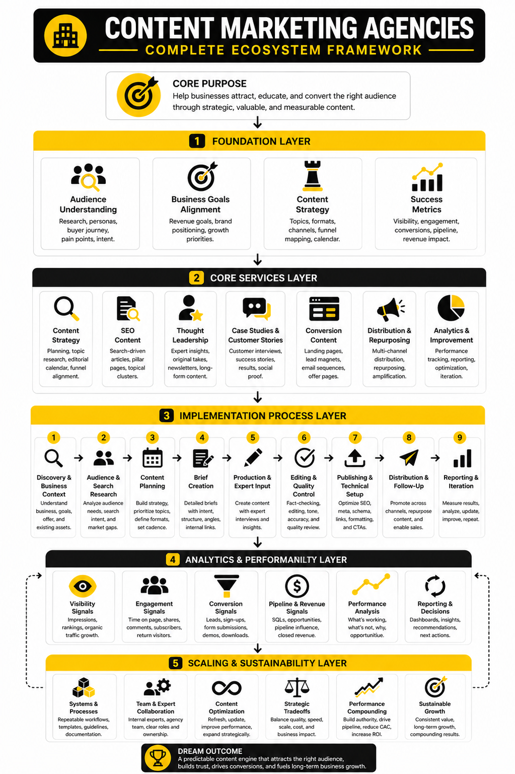 The easiest way to evaluate content marketing agencies is to separate strategy from execution. Strategy answers what should be created, who it is for, why it matters, how it will be distributed, and what business outcome it supports. Execution turns that strategy into articles, landing pages, newsletters, case studies, videos, social posts, lead magnets, and sales enablement assets.