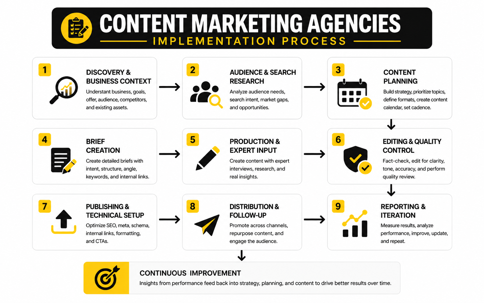 A good strategy is useful, but implementation is where content marketing agencies prove their value. This is the point where ideas become briefs, briefs become drafts, drafts become assets, and assets become part of a working growth system. If the process is vague, the results usually become vague too.