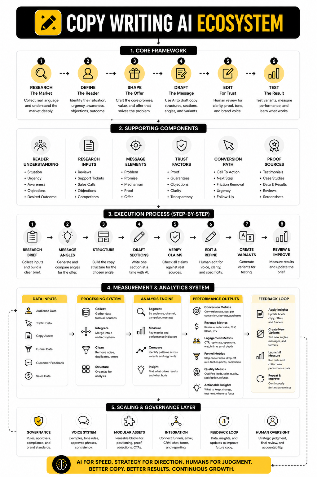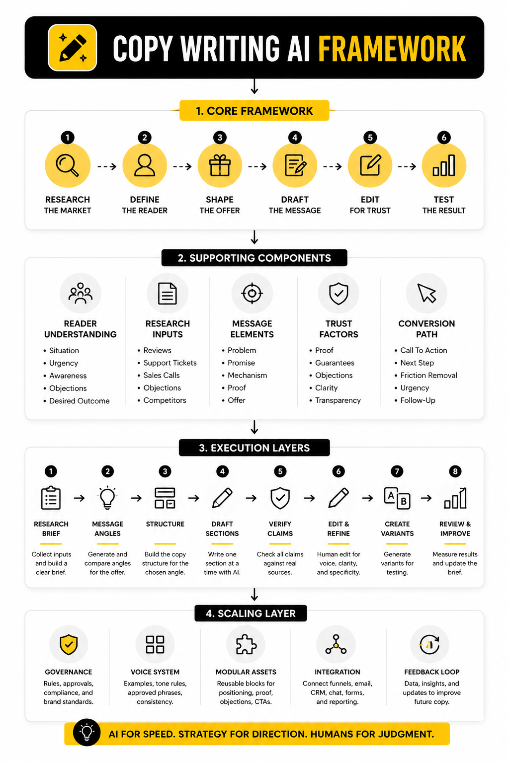 The strongest AI-assisted copy usually has four core components: the message, the structure, the proof, and the conversion path. If one of those is weak, the copy may still sound professional, but it will not persuade. This is why the process matters more than the tool.