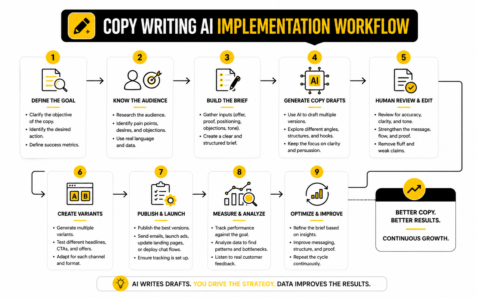 A useful copy writing AI workflow starts before the first draft. The framework is simple: research the market, define the reader, shape the offer, draft the message, edit for trust, and test the result. Each step gives AI a narrower job, which usually produces better output than asking it to “write high-converting copy” from nothing.