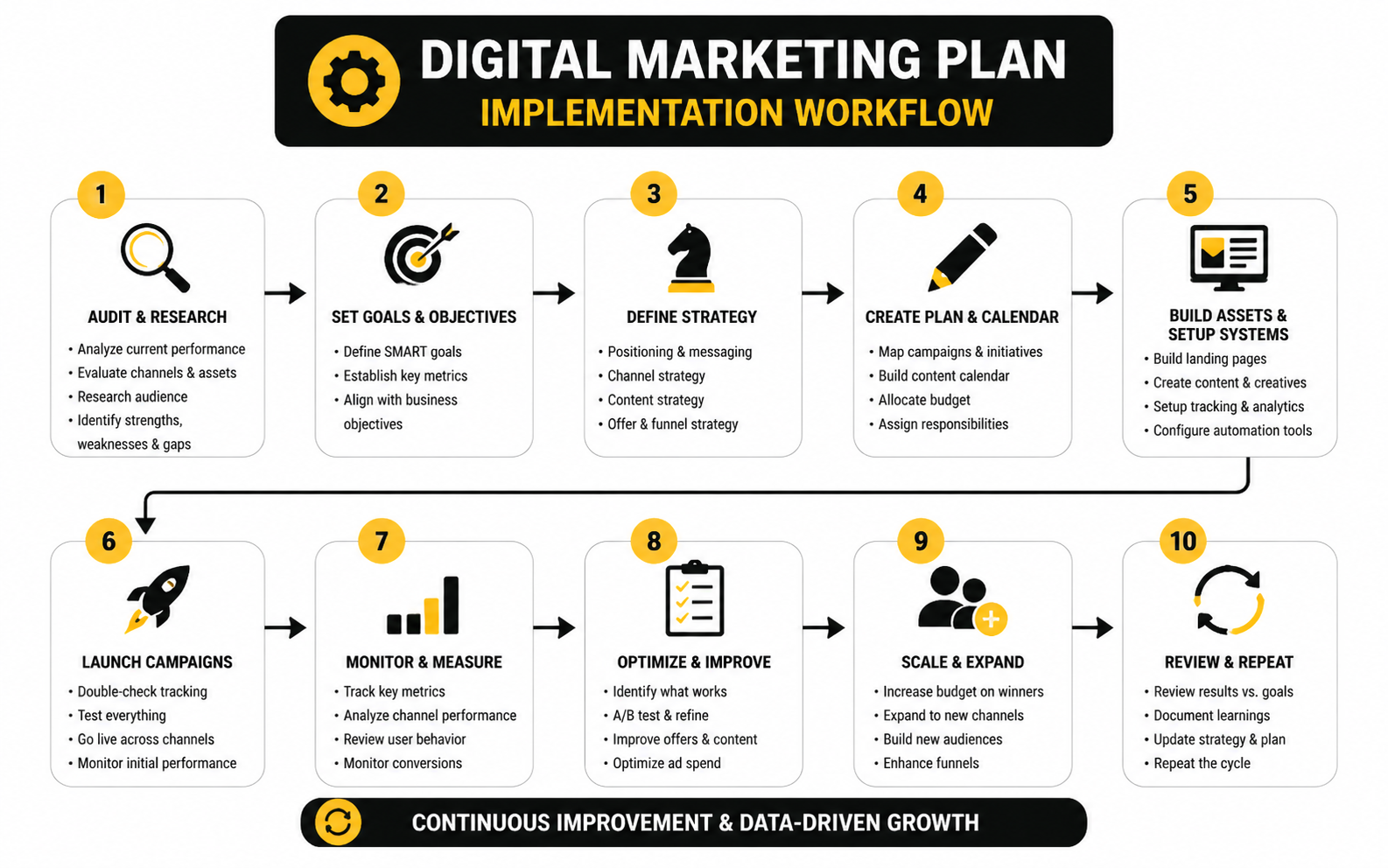Finally, monitoring and adjusting in real-time is critical. Implementation is not static; it requires continuous testing of messaging, creative, targeting, and channel mix. Tracking KPIs such as conversion rates, engagement metrics, and cost per acquisition informs iterative improvements. This dynamic approach allows marketers to optimize performance, ensuring the digital marketing plan delivers measurable growth while minimizing wasted spend.