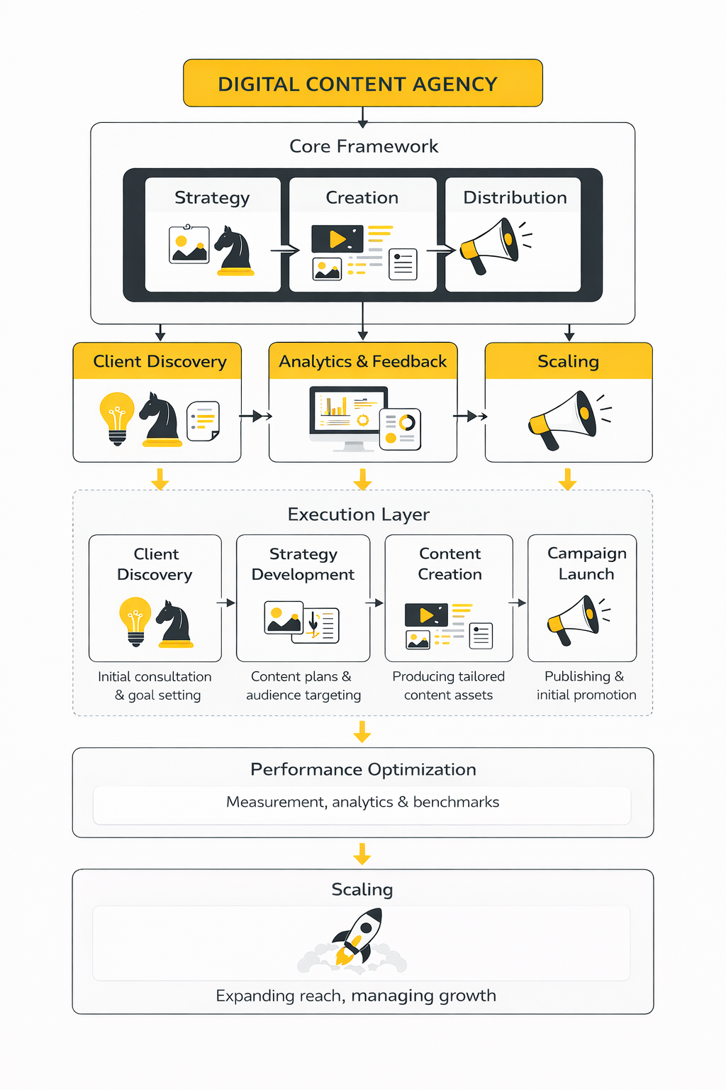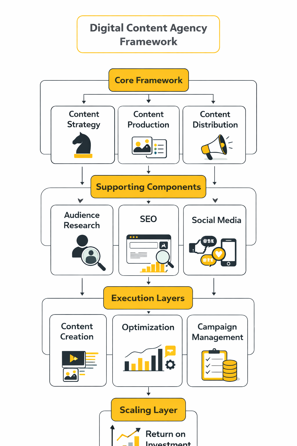 Once that measurement logic is in place, the next step gets easier to judge: which services, systems, and roles does a digital content agency actually need to run this model without bottlenecks or wasted motion?