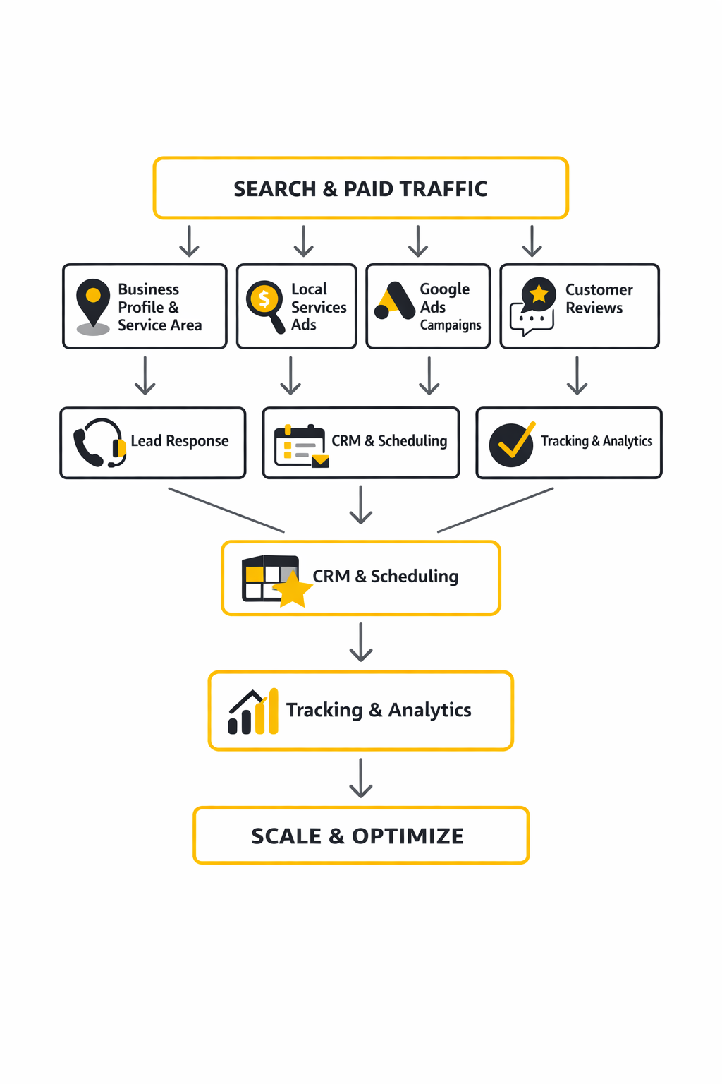 - Launch Local Services Ads before expanding search volume. Get verification, job types, photos, service areas, and reviews in shape so the lead quality starts from a strong base.