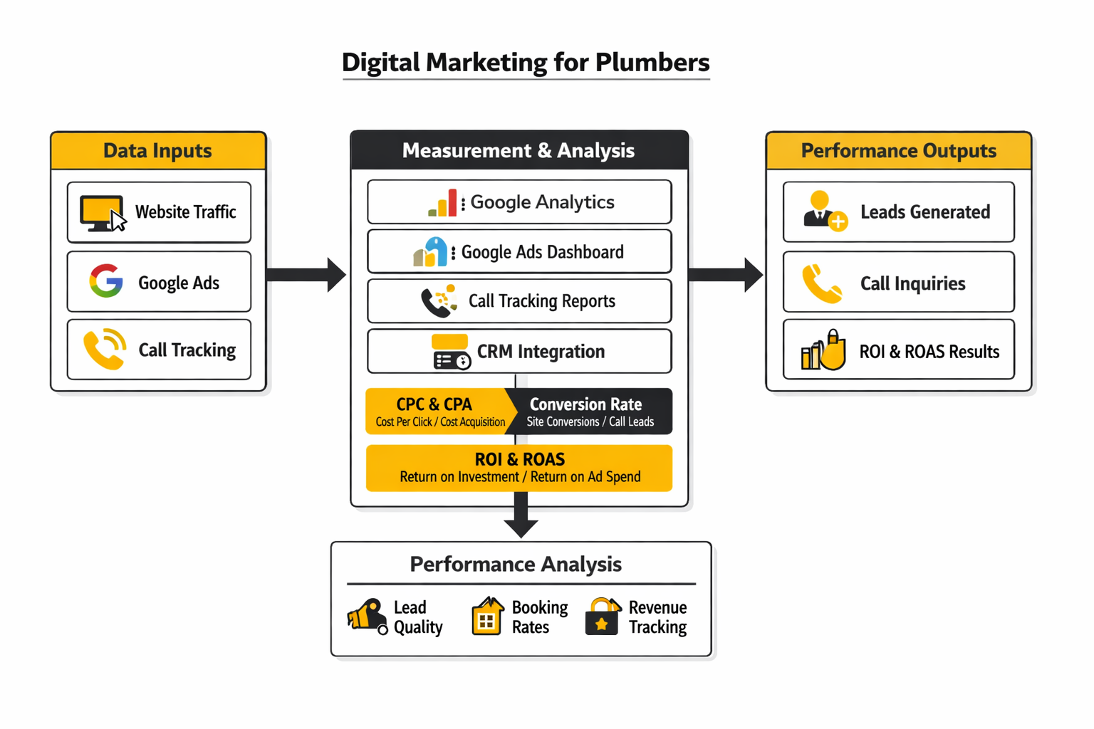 The dangerous thing about analytics is that it can make a plumbing business feel informed while it is still flying blind. A dashboard full of impressions, clicks, and traffic spikes looks impressive, but none of it matters if the phone is not ringing, the jobs are not getting booked, or the booked work is not profitable. That is why digital marketing for plumbers needs a measurement system built around visibility, trust, lead capture, booking, and revenue, not vanity numbers.