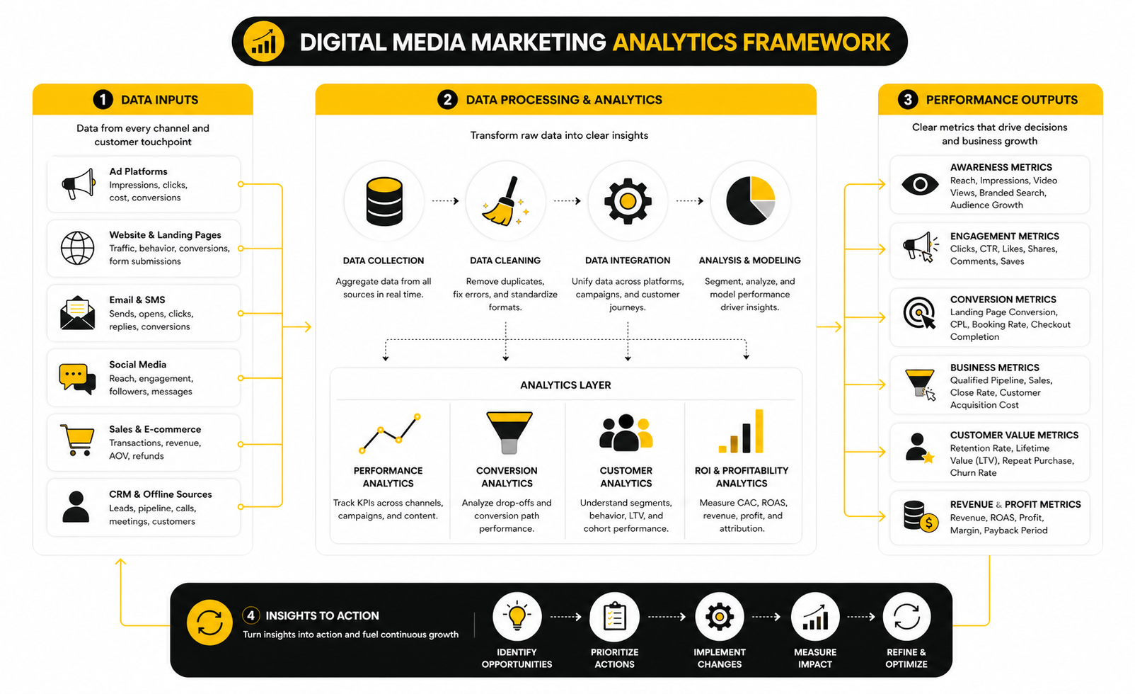 Digital media marketing is not just posting on social media, running ads, or sending emails. Those are channels and tactics. The real work is building a connected system where audience research, content, distribution, conversion, automation, and measurement support each other.