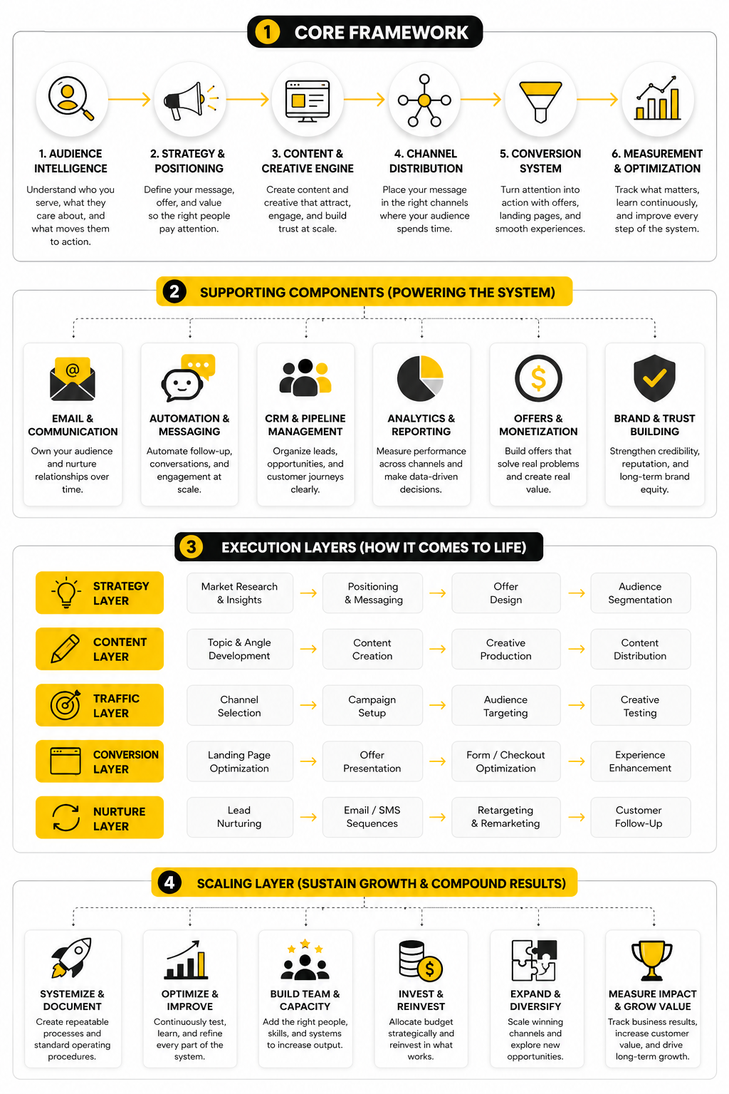 The structure here is built around six connected layers: audience, message, media, conversion, retention, and measurement. Each layer depends on the one before it. When teams skip the early layers and jump straight into posting, ads, or automation, they usually end up with more activity but no clear growth engine.