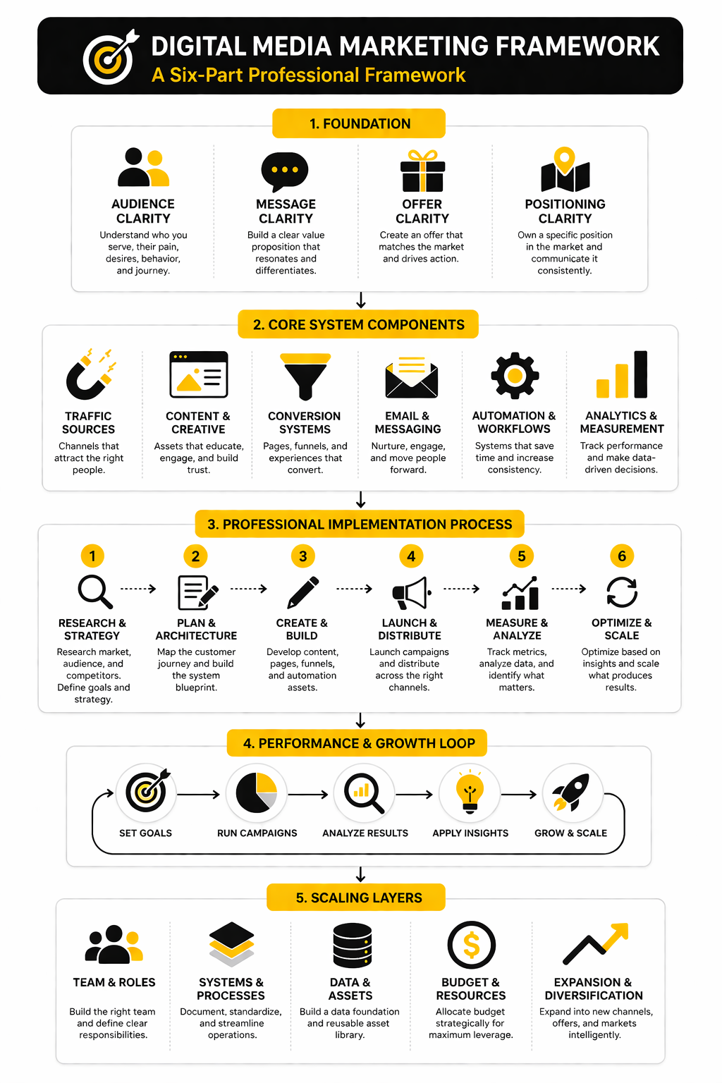 This is the practical lens for the next part of the article. Once you understand why digital media marketing matters, the next step is building the framework. Not a vague theory. A working structure you can use to decide what to create, where to distribute it, how to convert attention, and how to improve the system over time.