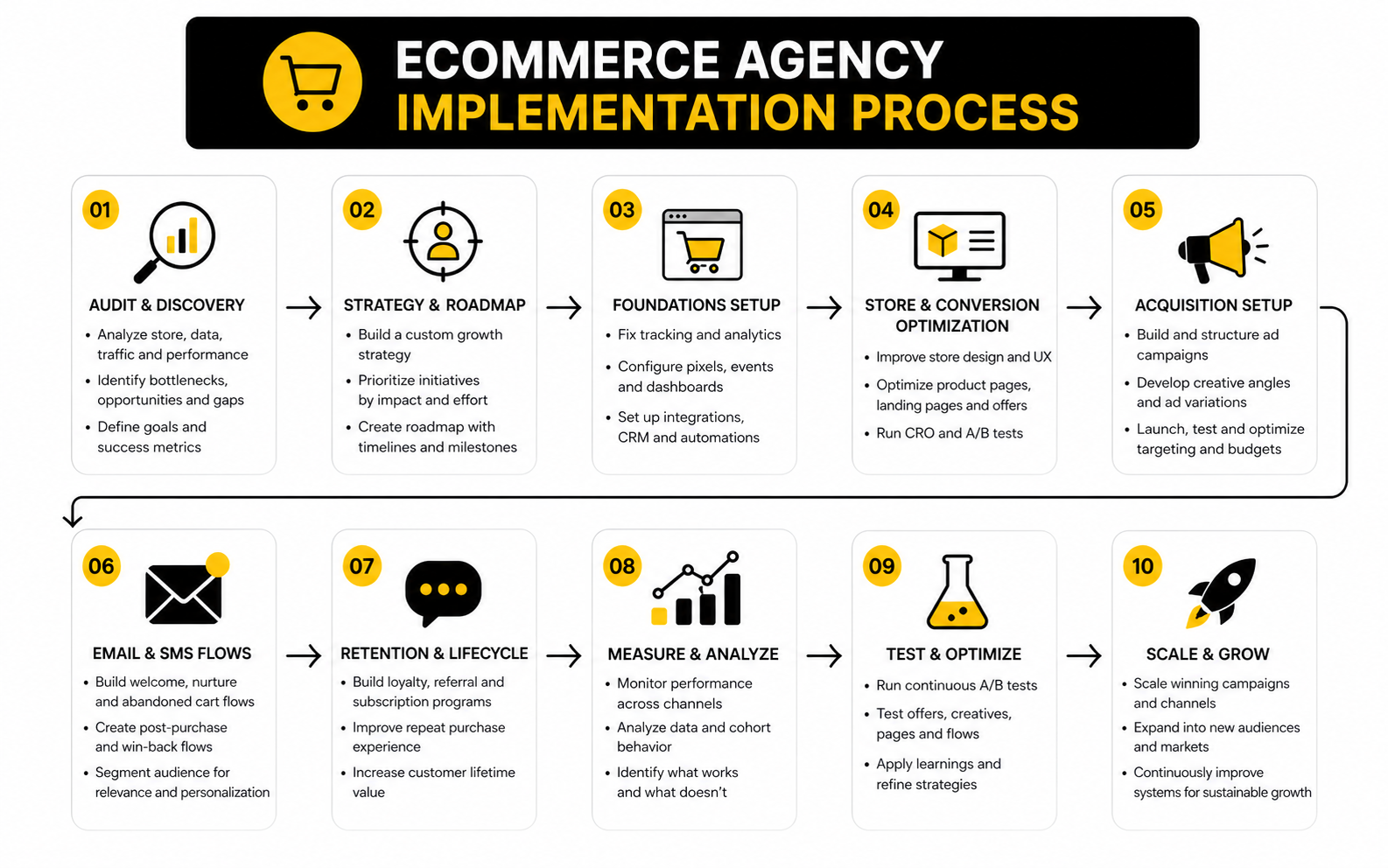A good implementation process turns messy business problems into a clear operating plan. The agency should understand the brand’s margins, traffic mix, offer structure, customer journey, retention patterns, creative performance, and technical constraints before making big recommendations. That early work may feel slower than jumping straight into production, but it usually saves money because the team stops guessing.