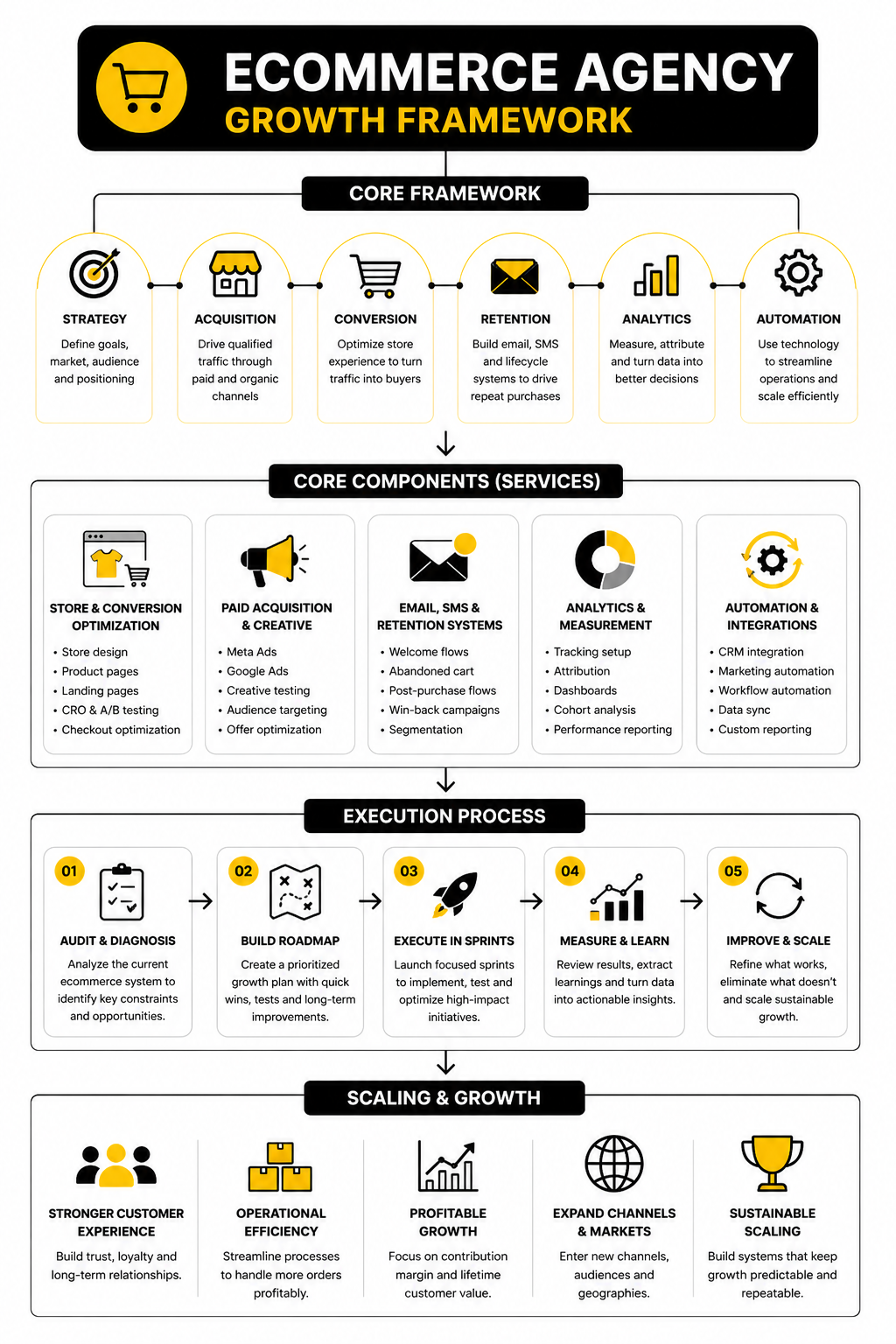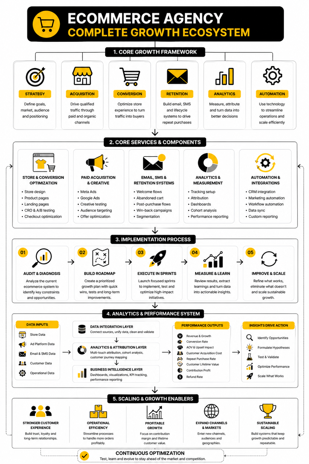 An ecommerce agency is a specialist partner that helps online brands grow revenue through strategy, execution, and measurement. Its work can include storefront optimization, landing pages, paid advertising, email marketing, SMS, retention, analytics, creative testing, and automation. The strongest agencies connect these pieces into one operating system instead of treating them as separate tasks.