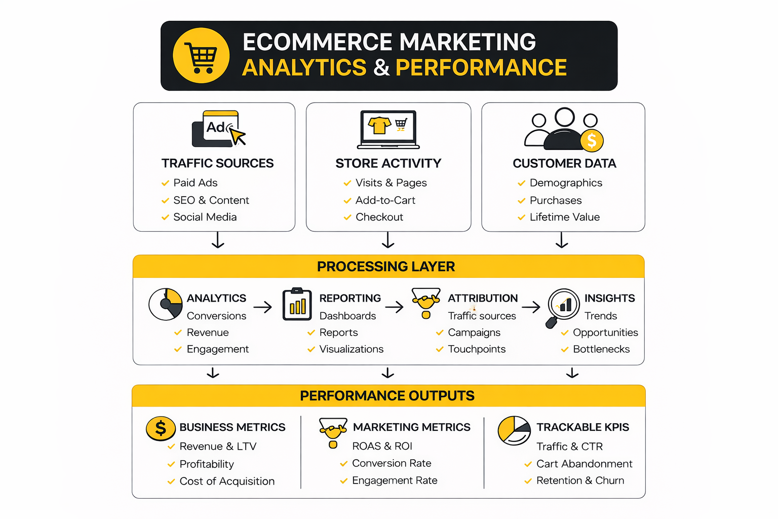 A practical analytics system for ecommerce marketing should answer five questions clearly: