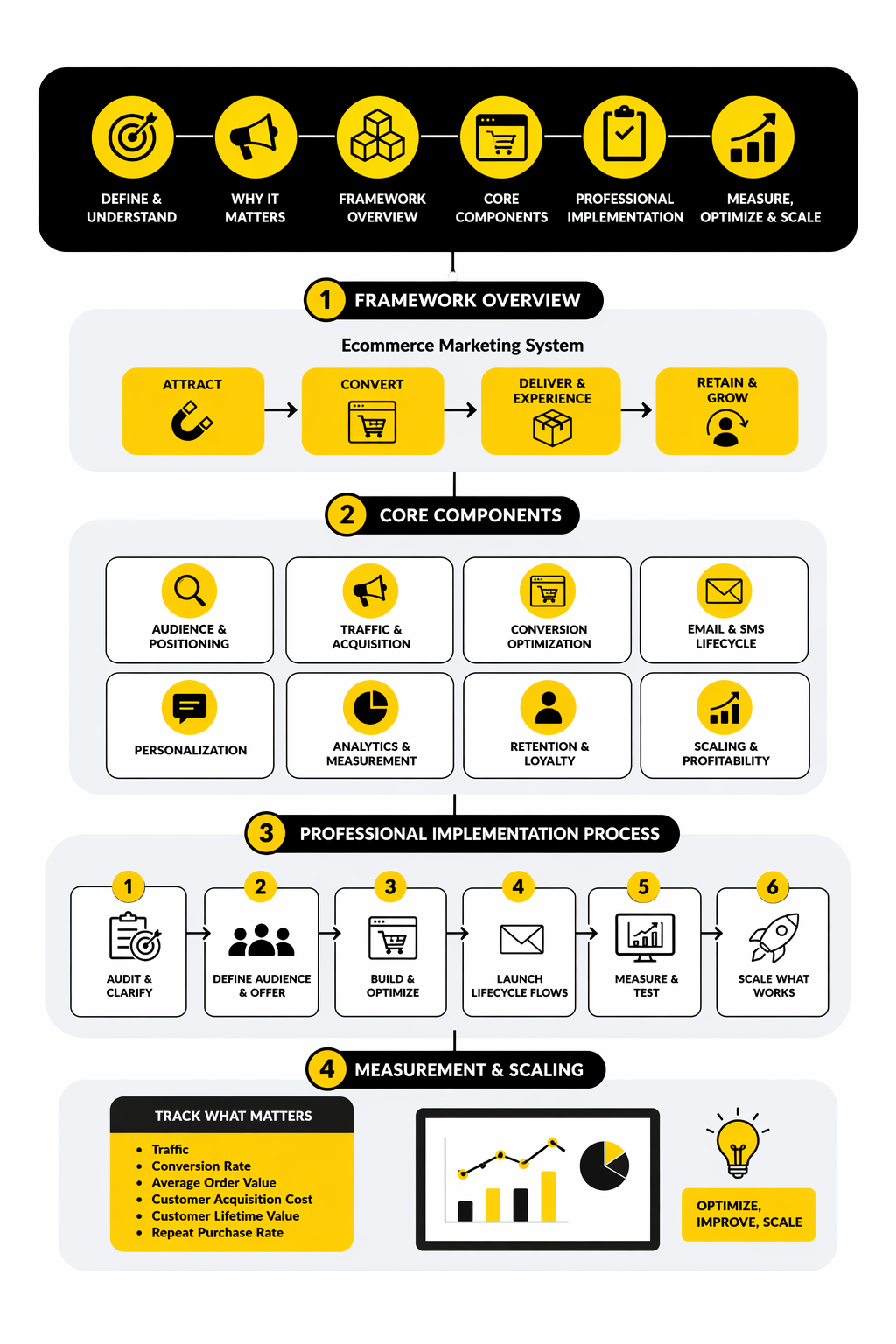 This framework works because each layer solves a different business problem. Traffic channels answer how people discover you. Conversion systems answer why they buy now. Retention programs answer whether the first order becomes a relationship. Measurement answers which parts deserve more budget, more creative attention, and more operational support.