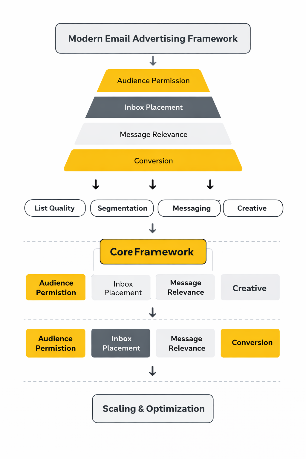 Modern email advertising works best when you stop treating it like a series of one-off campaigns and start treating it like a system with four linked layers: audience permission, inbox placement, message relevance, and commercial conversion. If one layer breaks, the whole program weakens. Great creative cannot rescue a damaged sender reputation, and perfect deliverability cannot rescue irrelevant offers.