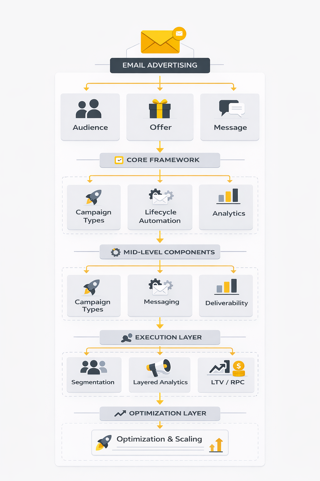 The simplest way to think about email advertising is this: every successful campaign rests on five connected decisions. You need the right audience, the right offer, the right message, the right delivery conditions, and the right follow-up path. If one of those breaks, the campaign usually underperforms no matter how polished the design looks.