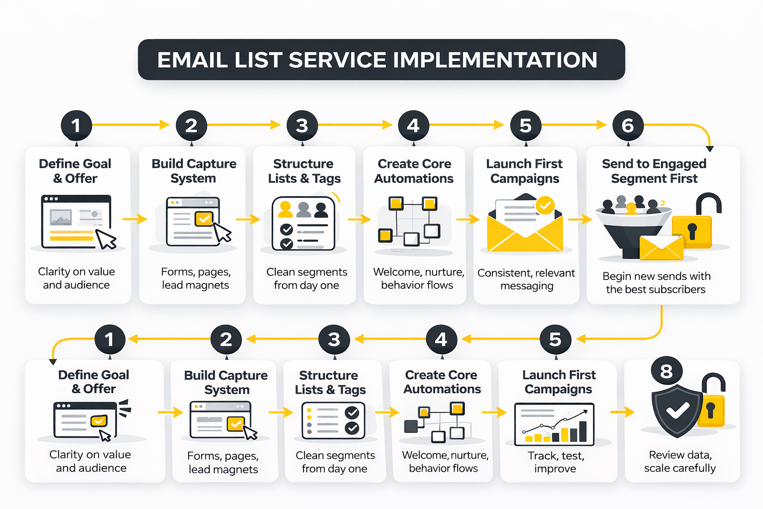The safest implementation process is boring in the best possible way. You set the technical foundation first, organize the data second, build the essential journeys third, and expand only after engagement data starts coming in. That order matters because deliverability damage is much easier to create than to undo.