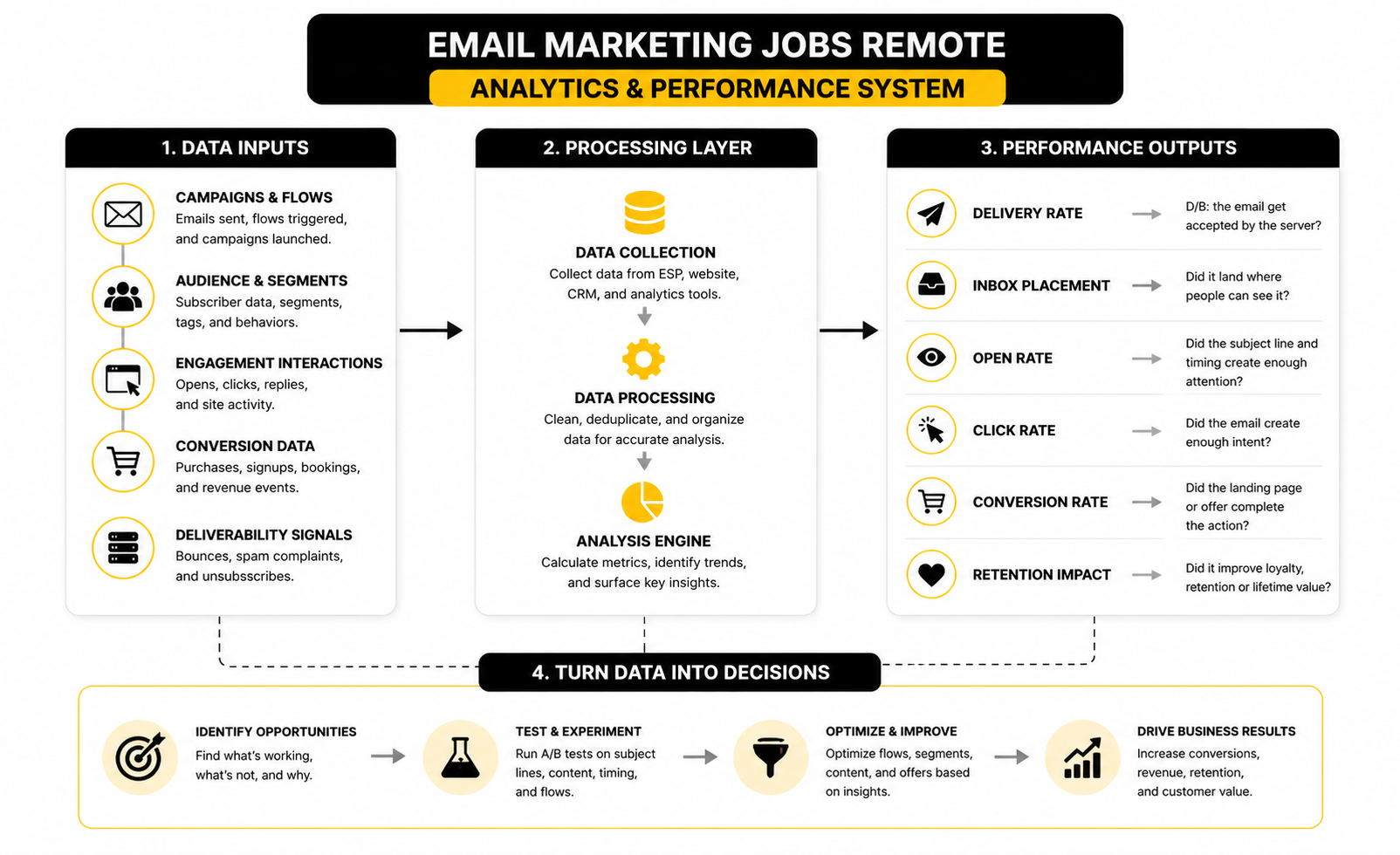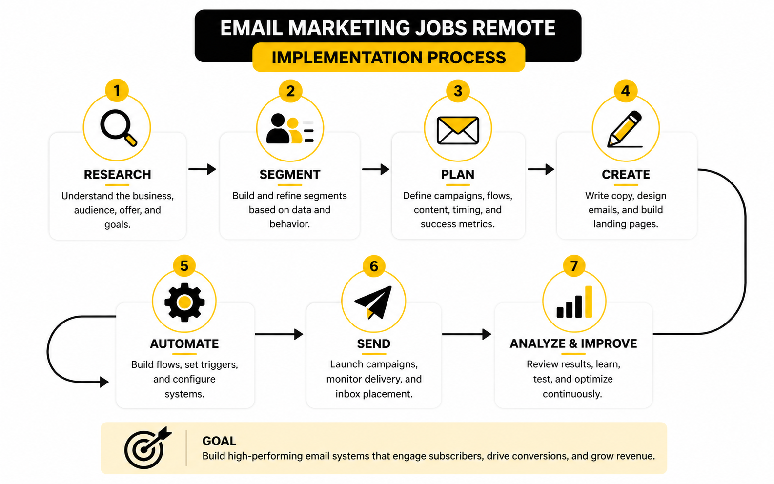 The simplest way to understand remote email marketing work is to see it as a system. You are not just writing subject lines. You are helping a business move the right person from one stage of the customer journey to the next with timely, useful, measurable communication.