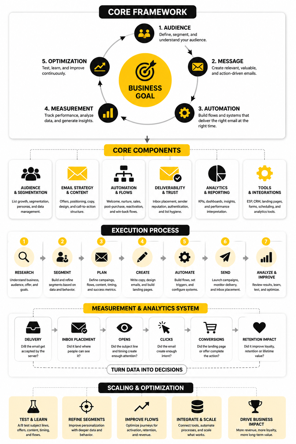 You should understand delivery rate, open rate, click rate, click-to-open rate, conversion rate, unsubscribe rate, spam complaints, bounce rate, revenue per recipient, and list growth. More importantly, you should know what each metric can and cannot prove. Metrics are useful when they guide decisions.