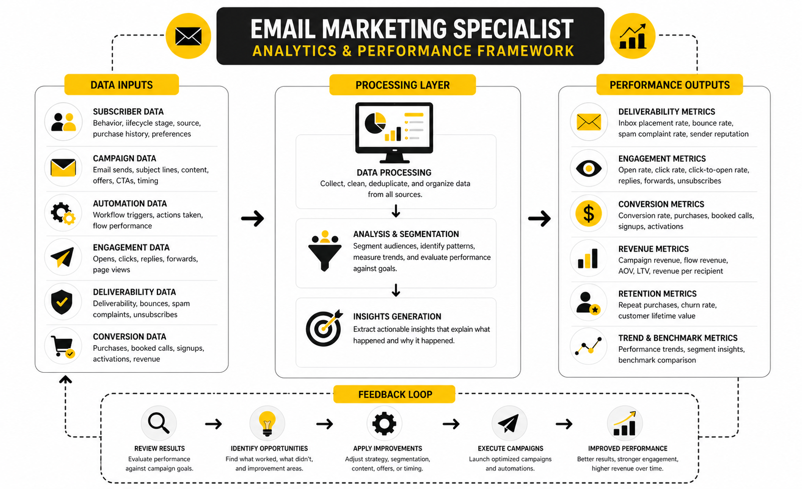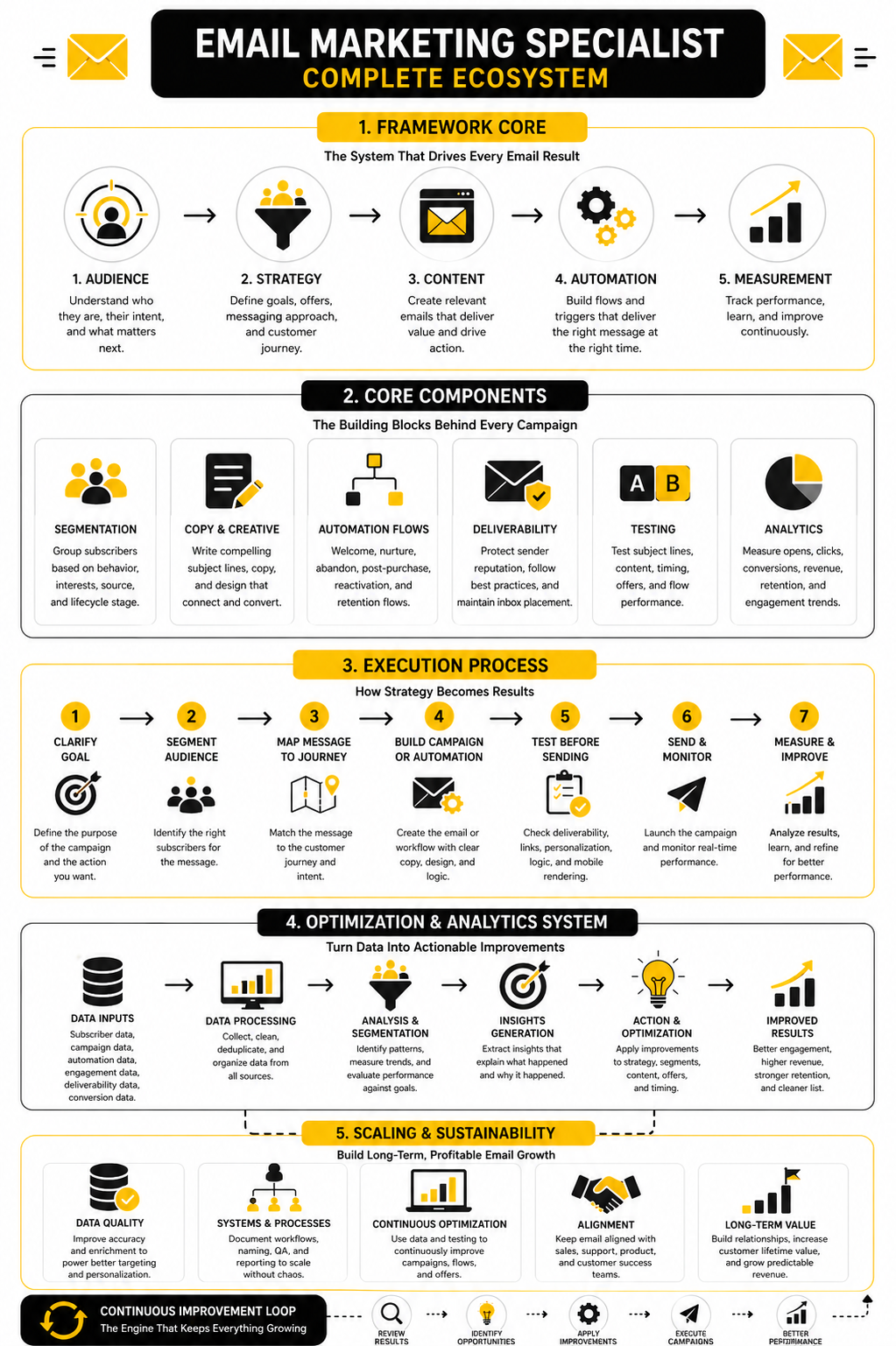 An email marketing specialist plans, builds, sends, tests, and improves email campaigns and automations. The role usually includes segmentation, copywriting, workflow setup, reporting, deliverability monitoring, and campaign optimization. In a stronger business setup, the specialist also connects email to revenue, retention, and customer experience.