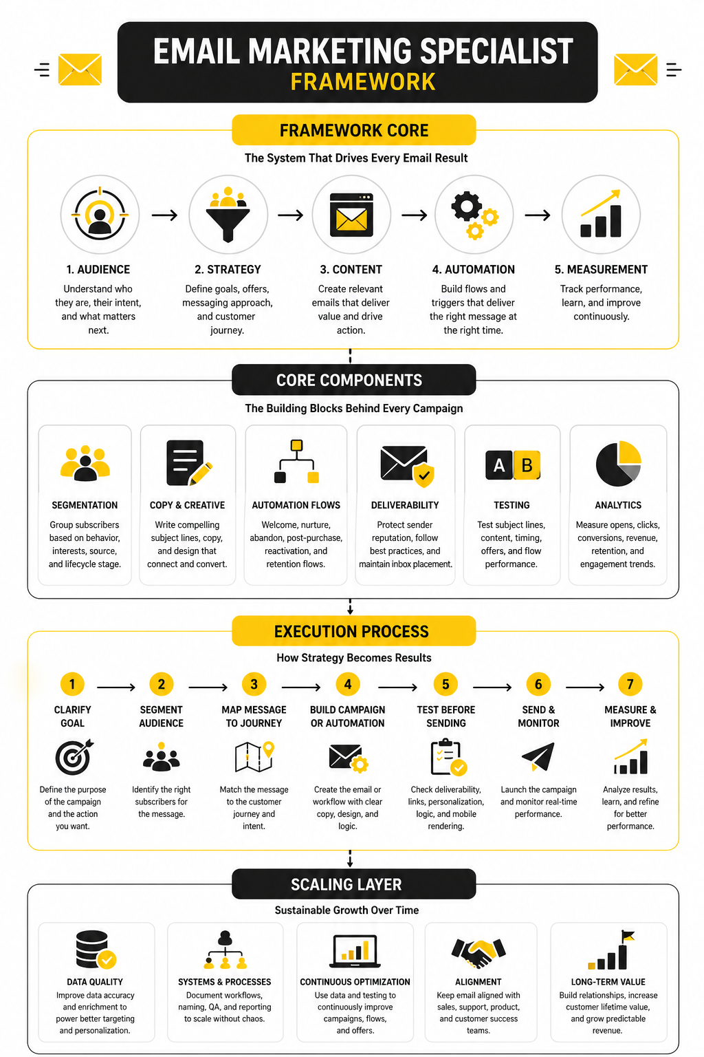 The core responsibility of an email marketing specialist is not “send more emails.” It is to build a reliable process that turns customer intent into useful communication. That process starts before the first subject line is written and continues after the campaign results come in.