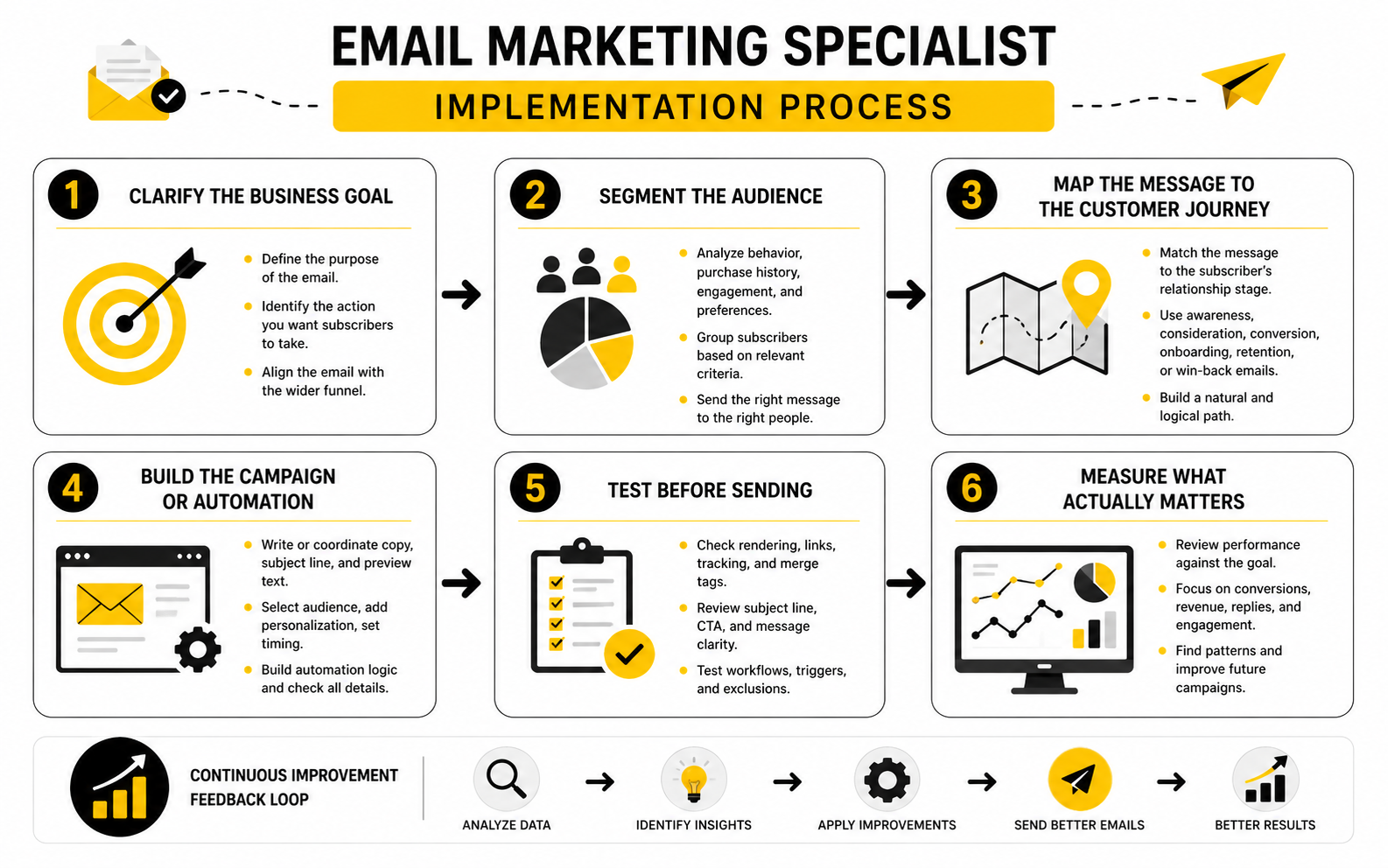 This is also how future campaigns improve. The specialist looks for patterns, not isolated wins. Over time, the data should sharpen segmentation, messaging, offers, timing, and automation logic. That feedback loop is what turns email from a task into a growth system.