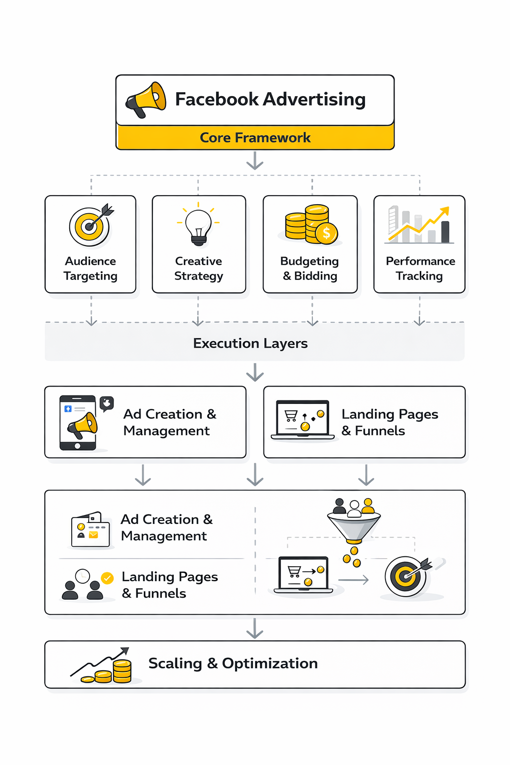 Once creative, targeting, and measurement are understood properly, execution gets much simpler. Not easy, but simpler. The goal is not to build the most complicated account in your market. The goal is to build an account structure that gives Meta enough clarity to learn, enough signal to optimize, and enough creative variation to keep finding efficient conversions.