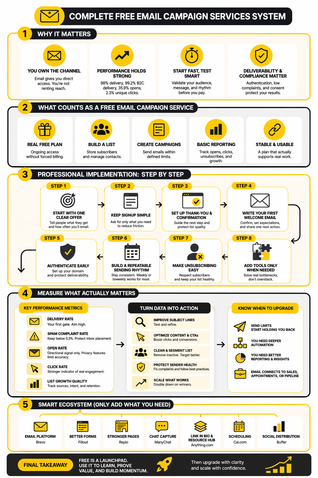 A professional implementation is not about stacking more tools. It is about sequencing the right moves so your list starts clean and stays manageable as it grows. With free email campaign services, the goal is to build a system that is light enough to launch quickly but structured enough that you do not have to rebuild everything after your first few hundred subscribers.