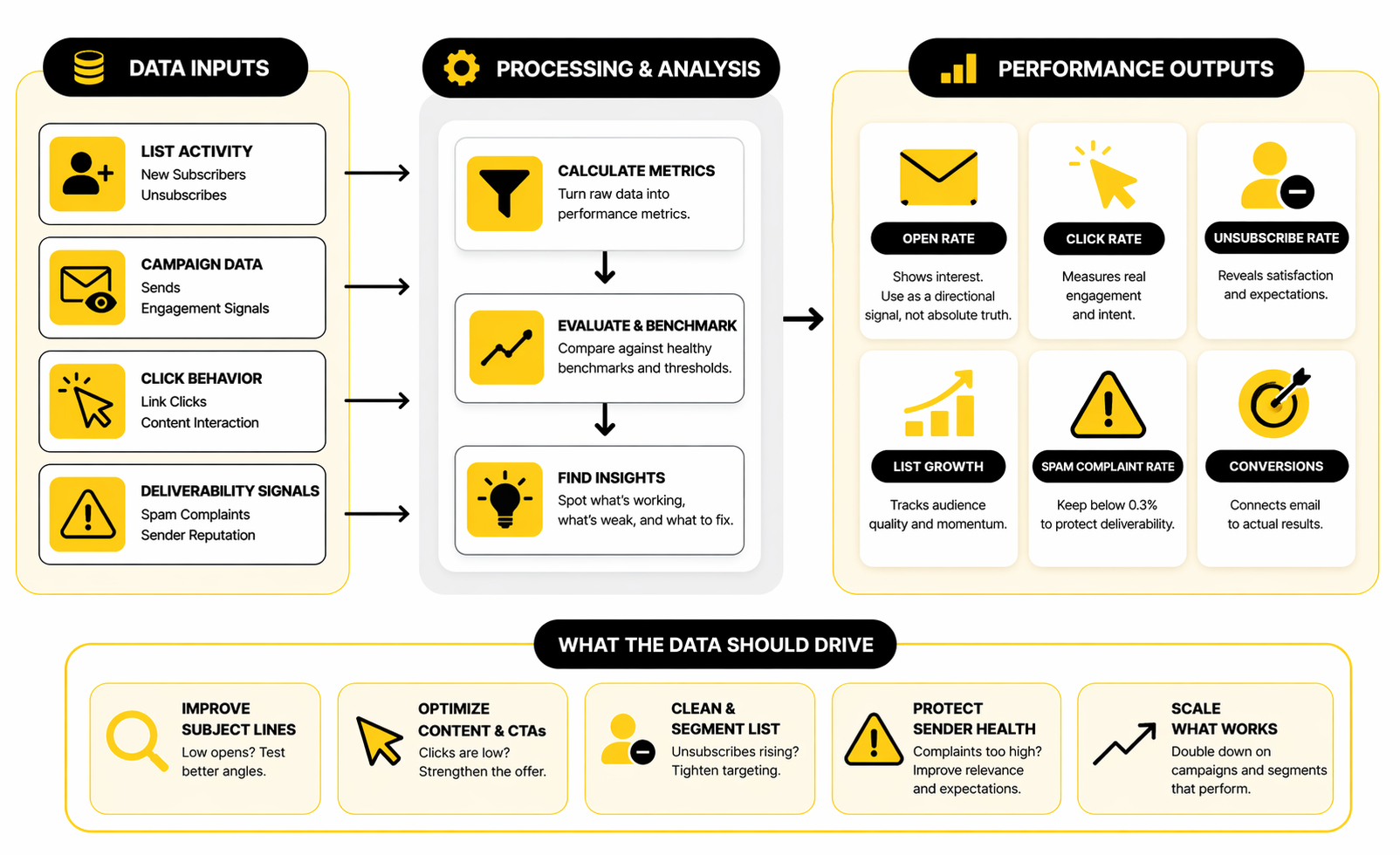 - Review performance based on clicks, replies, unsubscribes, and list growth rather than obsessing over opens alone.