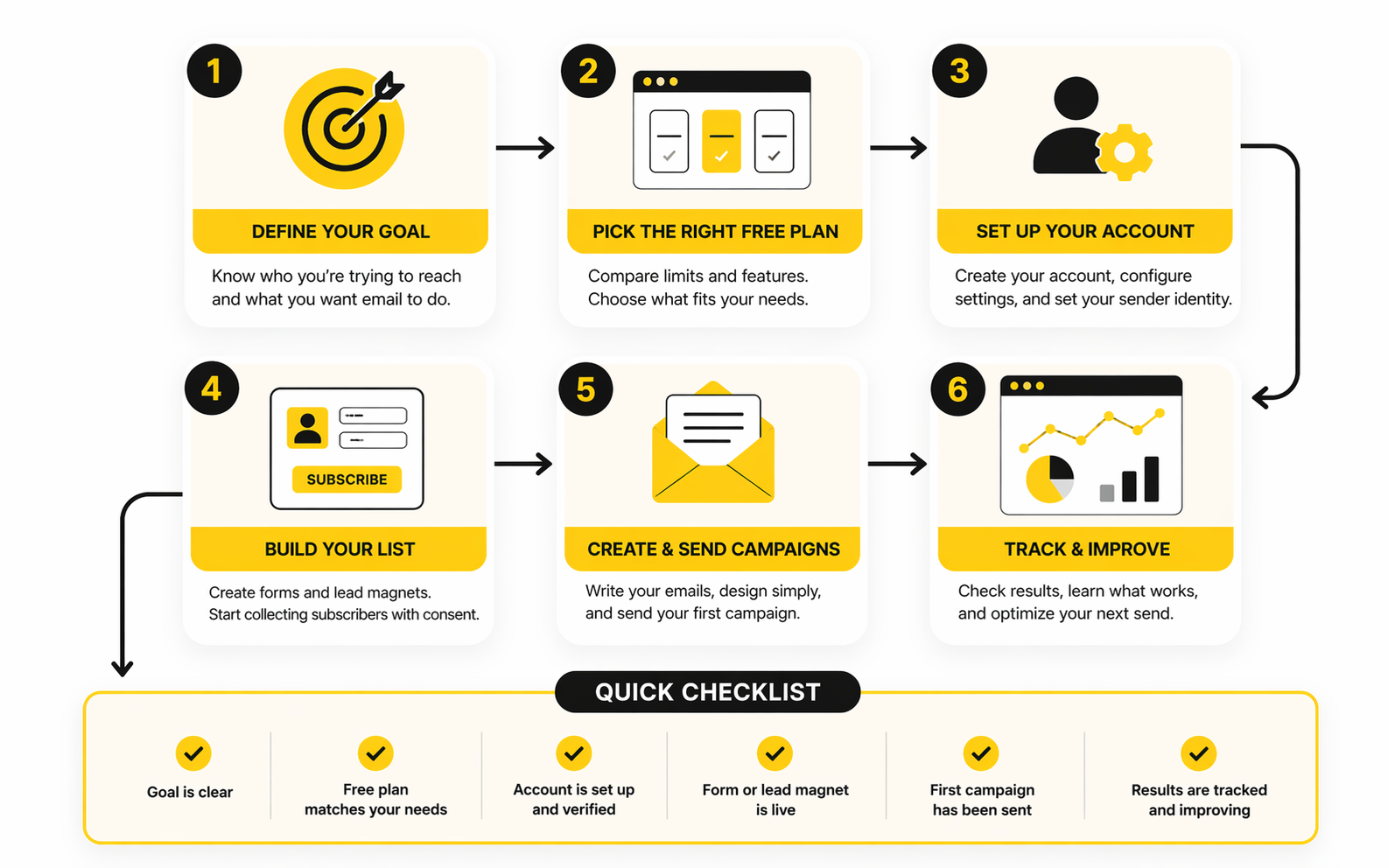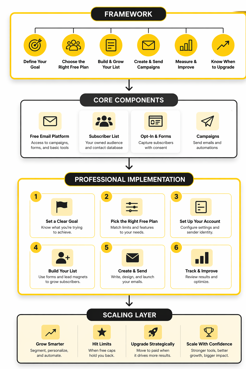 A professional setup on a free plan should feel simple on the surface and disciplined underneath. You do not need a giant stack, but you do need the basics working together: a signup point, a clear promise, a confirmation flow, a welcome email, a sending schedule, and a clean unsubscribe path. If any of those pieces are missing, your list may grow, but it will not grow well.